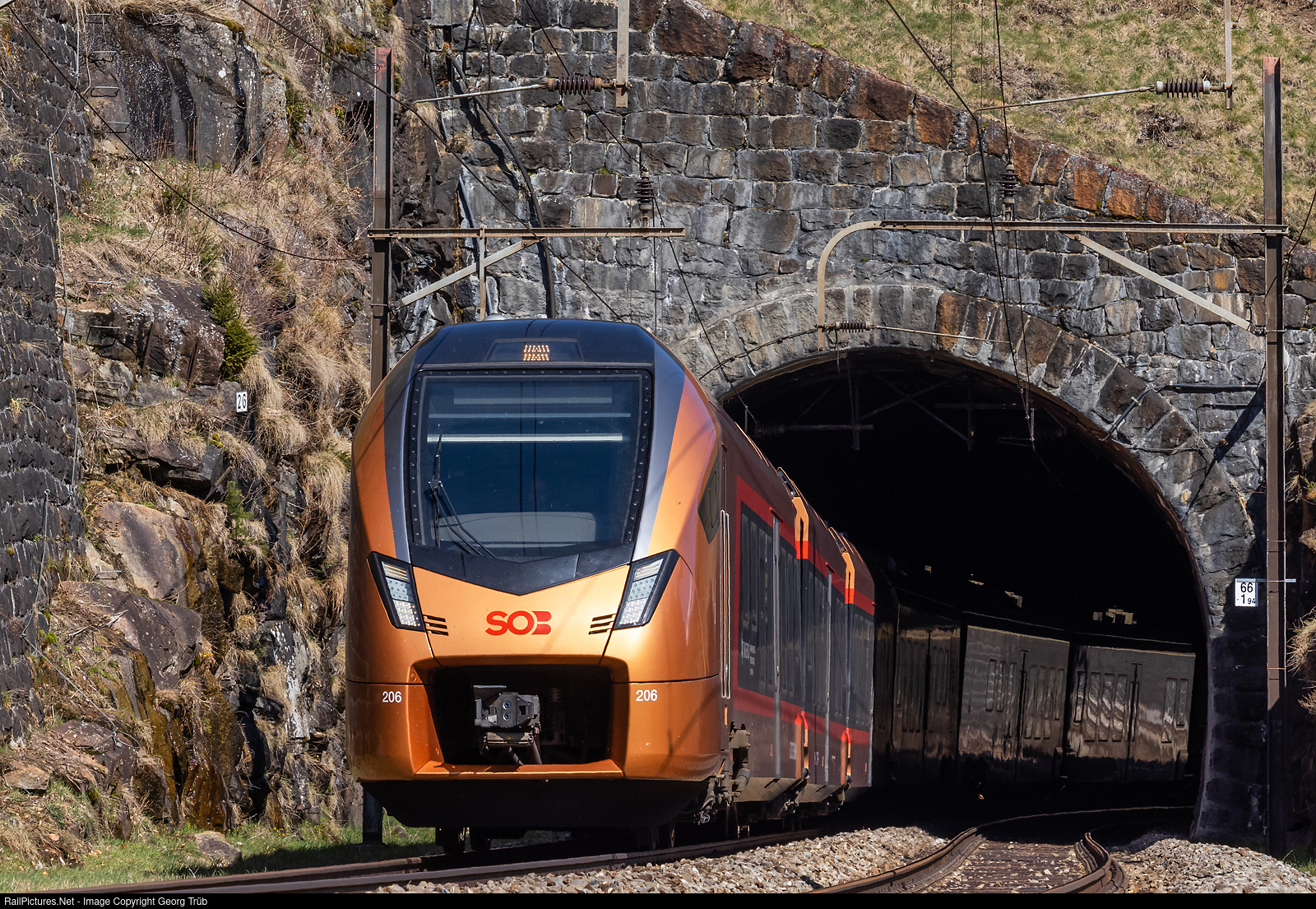| "Traverso" RABe 526 206/106 of the Südostbahn (SOB) is running the IR 2417 TRENO GOTTARDO of the line IR 46 from Zürich to Locarno over the Gotthard mountain line, leaving the upper Entschigtal avalanche protection gallery between Wassen and Göschenen. |