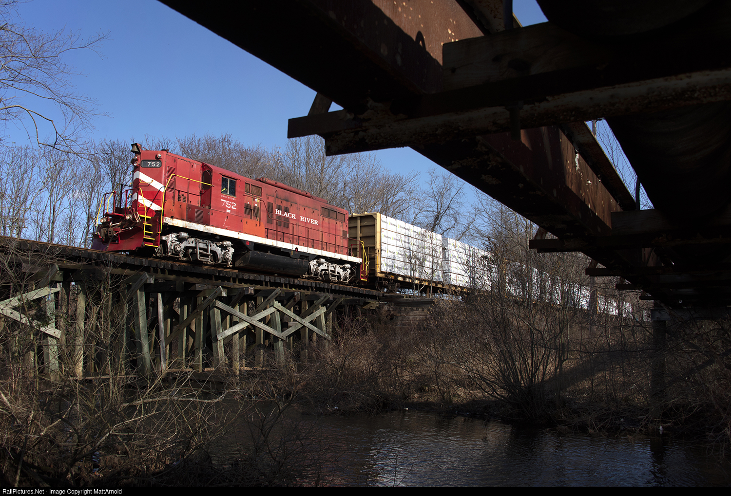| BDRV 752 pulls eight lumber loads south over a wooden trestle spanning the South Branch Metedeconk River at Lakewood, NJ, on Feb. 24, 2023. |