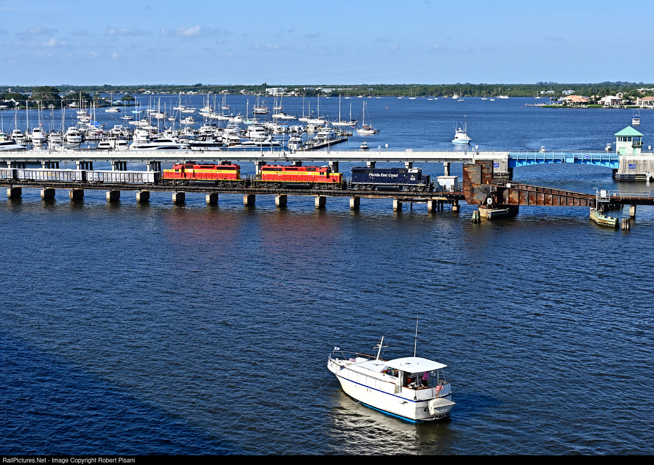 | 336 was the third of three FEC trains in a row to cross the St. Lucie River on this fine spring morning. GP40-2 429 was an unexpected, pleasant surprise on the head end and broke up what would have been a consecutively numbered set of "Champion" SD40-2s. 336 was running late and would typically be through here under the cover of darkness. At least seven boats have gathered and were waiting patiently for FEC's "morning rush" but they would soon by on their way after 336 cleared. |