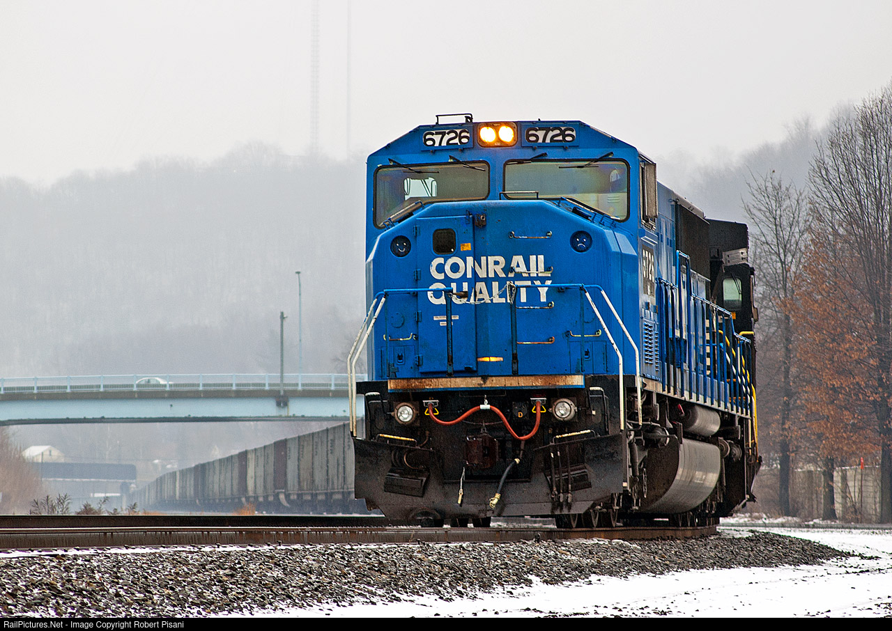 A former Conrail SD60I leads a crewless empty coal train that is tied down at CP Wing. Someone has drawn a happy face and sad face in place of the removed FRA marker lights on the nose of 6726.