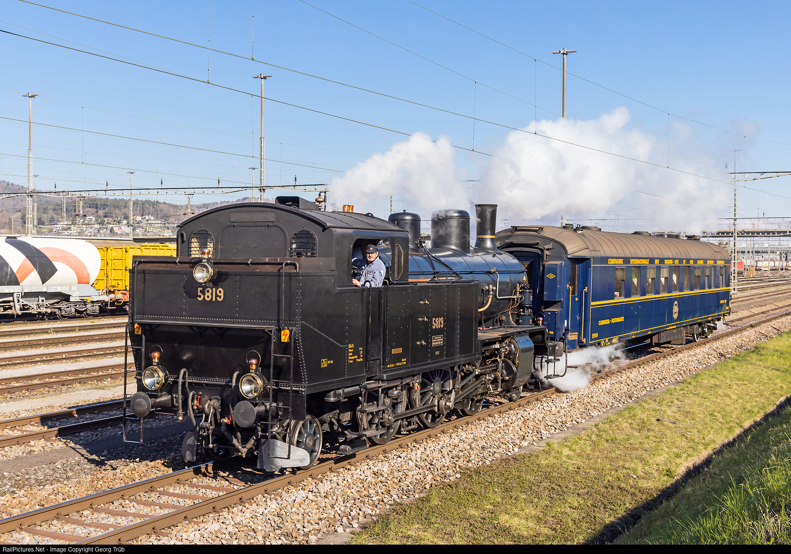 | The 2-6-2 steamlocomotive Eb 3/5 # 5819 of SBB Historic is on a test run after replacing the boiler tubes, from Zürich Vorbahnhof to Brugg AG, on the south passing track of the Limmattal shunting yard. In tow is the former CIWL dining car WR # 2749 of the steam group Zürich. |