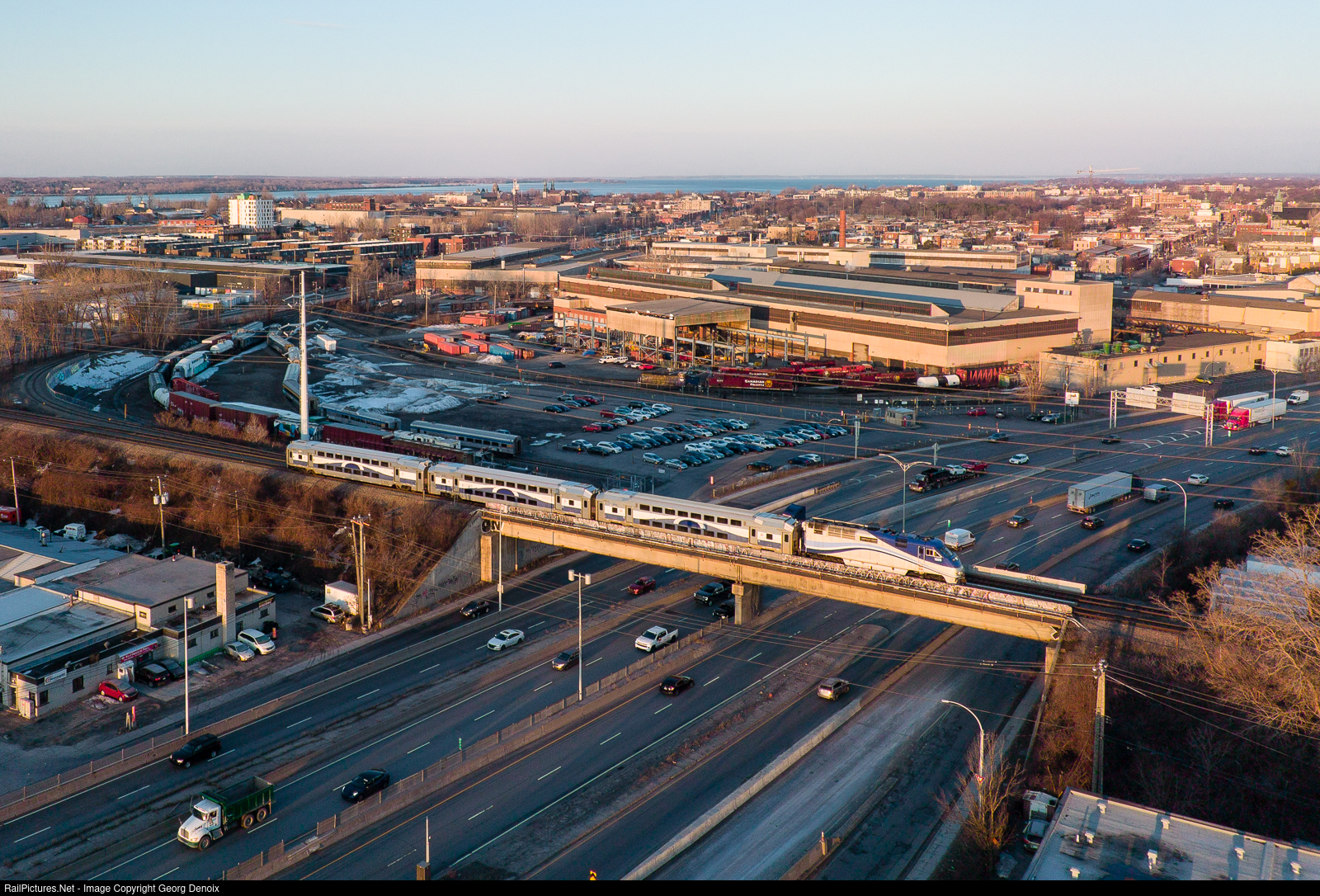 | Candiac to Montreal commuter train no. 72 passes over Highway 20, just in fron of CAD Railway Indistries, with VIA's stripped HEP cars in the yard. |