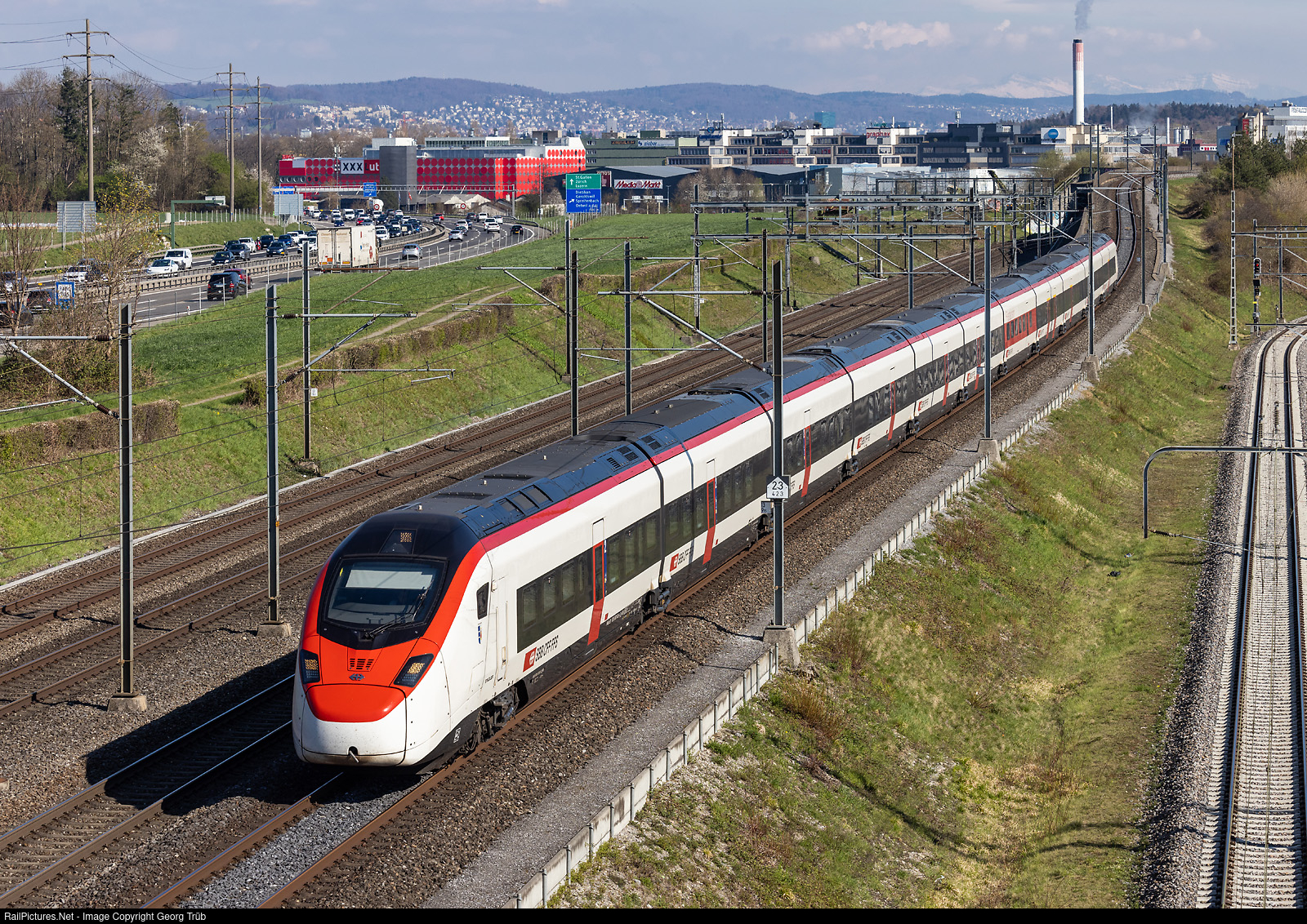 | "Giruno" highspeed train RABe 501 # 003 "San Gottardo" of the SBB is running the IR 2078 of the line IR36 from Zürich Airport via Zürich HB-Baden-Brugg-Rheinfelden to Basel, between Dietikon and Killwangen-Spreitenbach. |