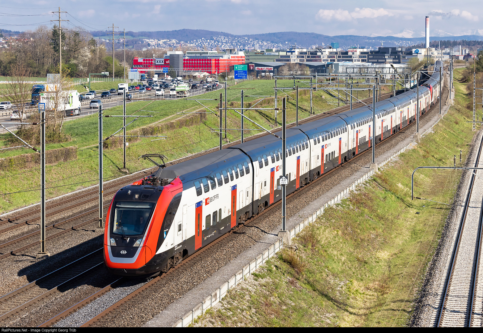 "FVD" or "Aquila" RABe 502 # 205 "Fribourg/Freiburg" (IR200) and RABDe 502 # 007 (IC200) of the SBB in multiple control, forming a 400 meter train, are running the IC 726 of the line IC1 from St.Gallen via Zürich-Bern-Fribourg-Lausanne-Geneva to Geneva Airport, between Dietikon and Killwangen-Spreitenbach.