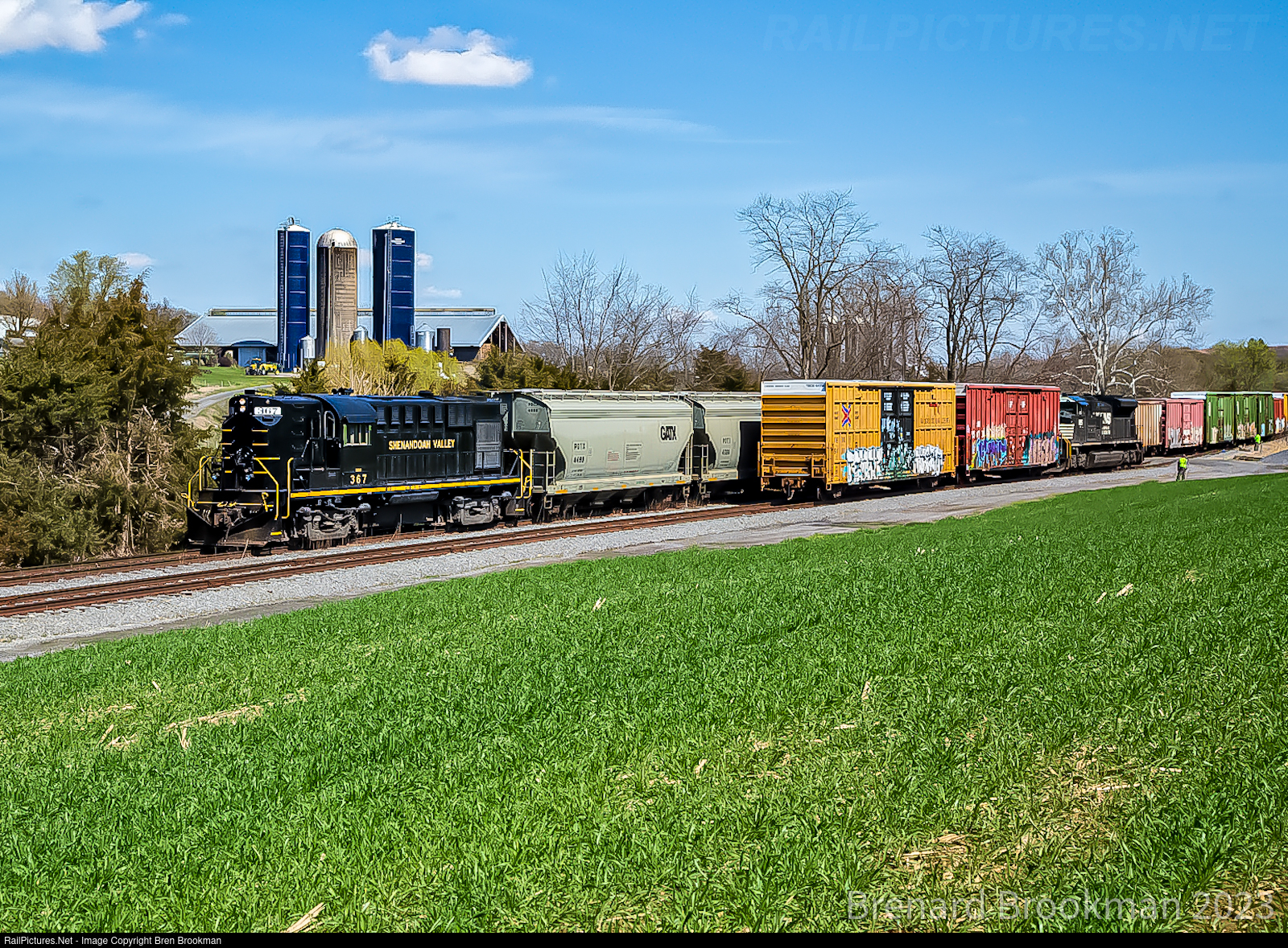 Shenandoah Valley RR local with their former N&W Alco RS-11 now DGVR 367 interchanging with the NS Harrisonburg Local V93. Seen here the Shenandoah Valley local is pulling their cut of cars brought down by NS V93 along with the rest of V93's train south while V93 pictured in the siding attached to two boxes that SVRR local brought up, in order to make their run around moves at this location they have to pull each other back and forth whoever has the heaviest traffic usually SVRR pull the traffic in the clear for V93 and the they will hook back on, on the north end of the train and then split the train and each will go their respective ways.