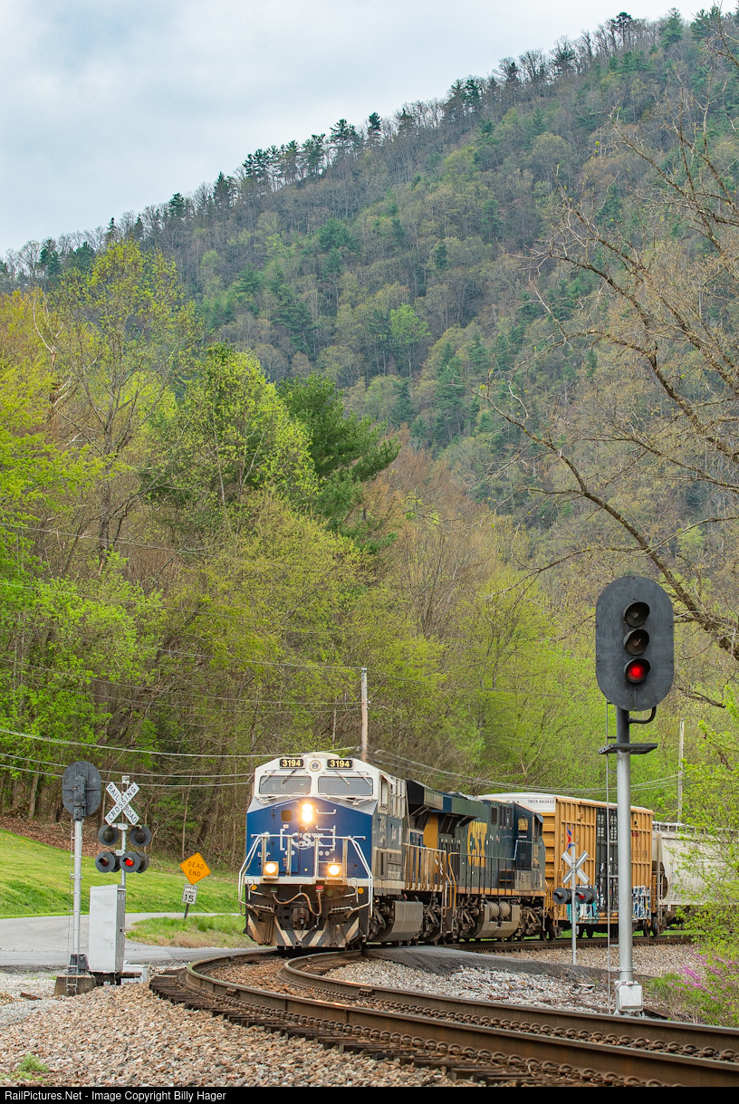 Northbound CSX M652-05, with the CSX 3194, Honoring Law Enforcement engine in the lead, splits the signal at Chestoa, coming out of the Nolichucky River Gorge into Erwin.
