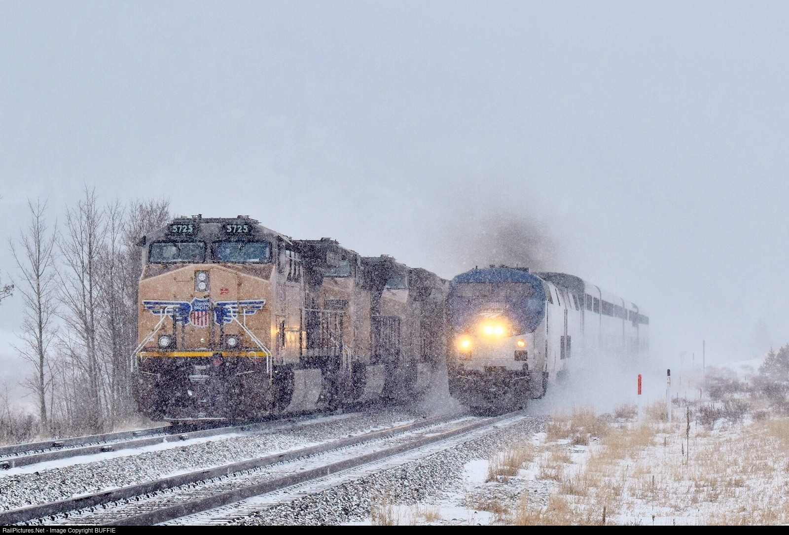 UP 5725 (AC4400CW-CTE) waits on the siding in Tolland, Colorado as the Amtrak Winter Park Express Ski Train passes on the main track.