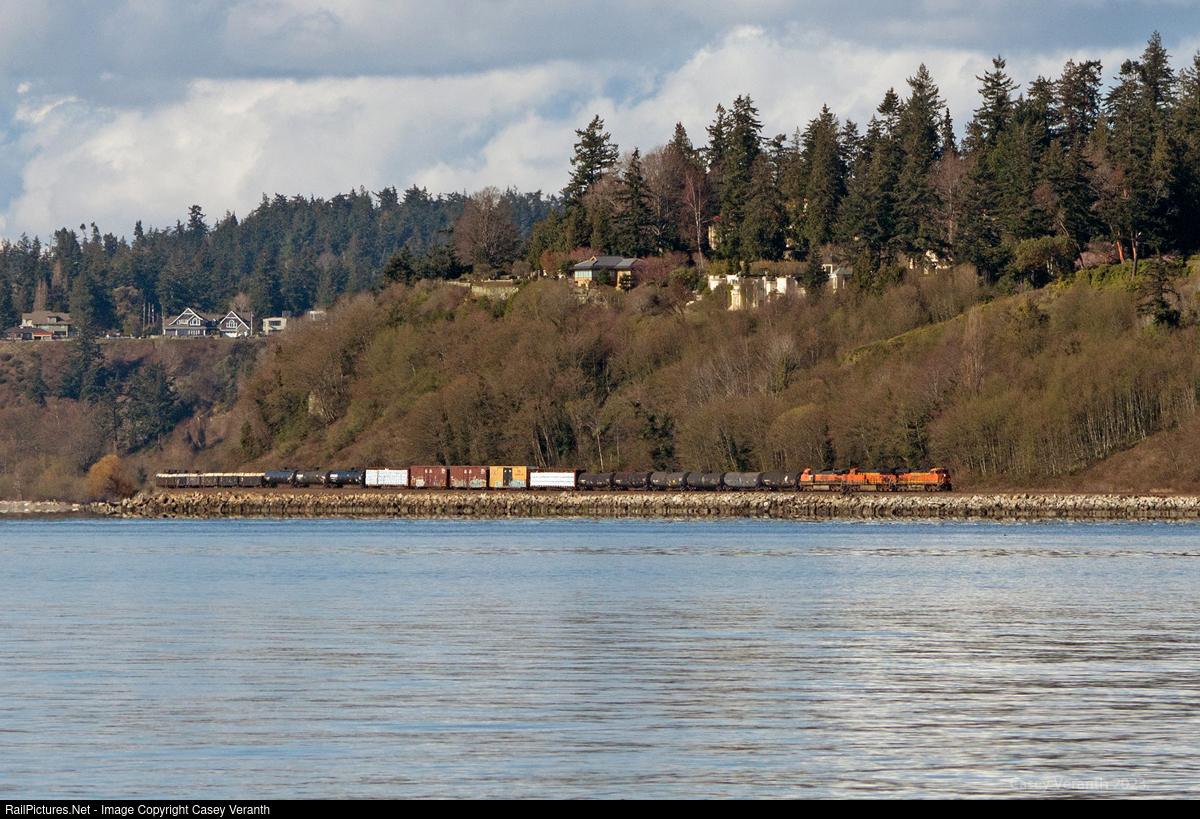 | Milepost 12 on the BNSF Scenic Sub was once known as the 'Million Dollar Mile', but it's a name that has been lost to time. The name does not come from the many nice houses that make for no wrong side of the tracks in this area, but from the fact that this is the newest section of the Scenic Subdivision along Puget Sound. In the 1960s, Great Northern moved the track hundreds of feet further out to sea and the hill you see behind the track is still an active landslide area. |