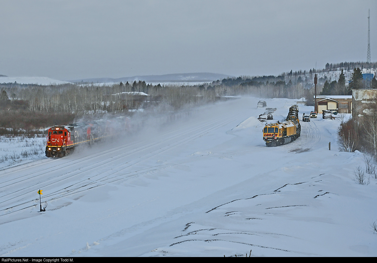 | Just before the sun rises on a cold April morning, CN 2031 is scurrying along the CN Iron Range Sub and passing through the yard at Biwabik, MN heading towards home at Two Harbors. |