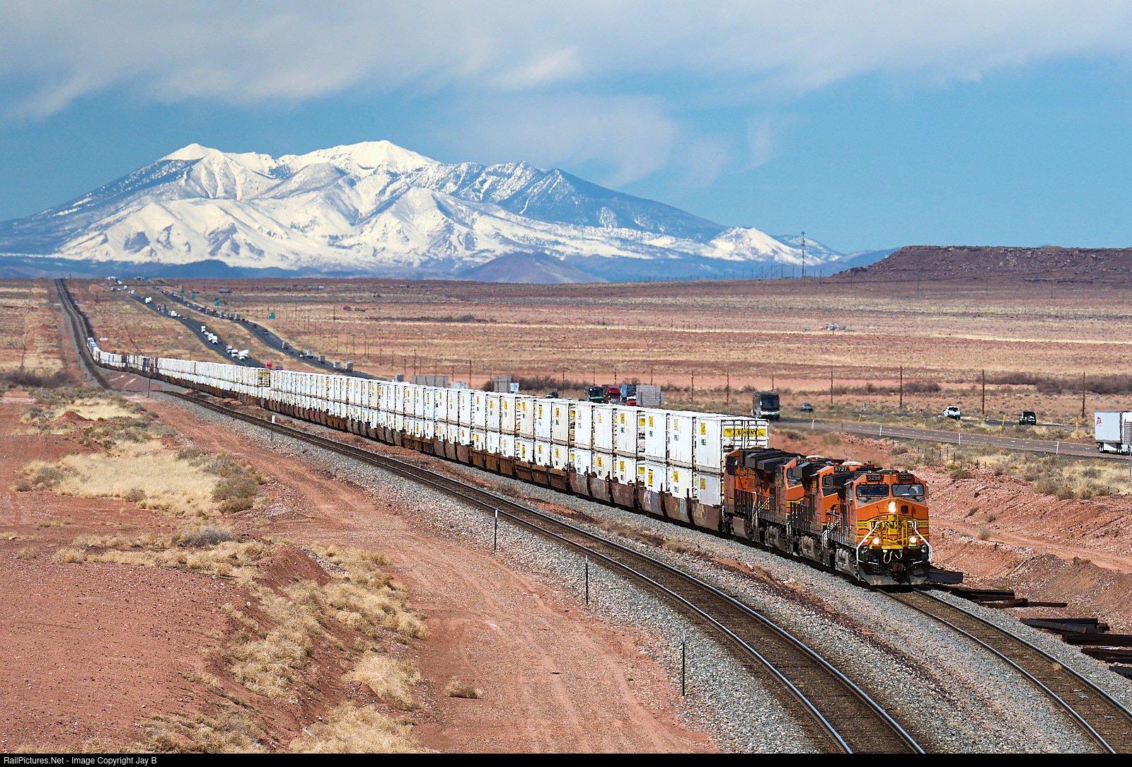 BNSF intermodal at Winslow. San Francisco peaks in the background.