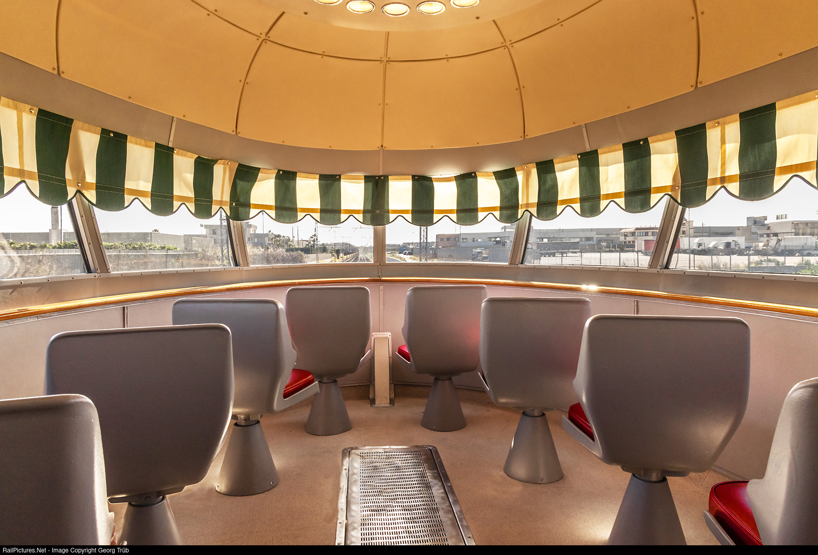 | The 4 ETR 250 "Arlecchino" trains (built 1960) of Trenitalia, as well as the 3 longer ETR 300 "Settebello" (built in 1952/1959), have a 180 degree round viewing lounge or pulpit in front and rear of the train, the engineer is in a cab on the roof above. There are 8 single rotating seats and at the back wall a bench with 3 places. View into the pulpit of ETR # 252 of the Fondazione FS Italiane on the journey along the adriatic sea from Bari to Ancona and Bologna. |