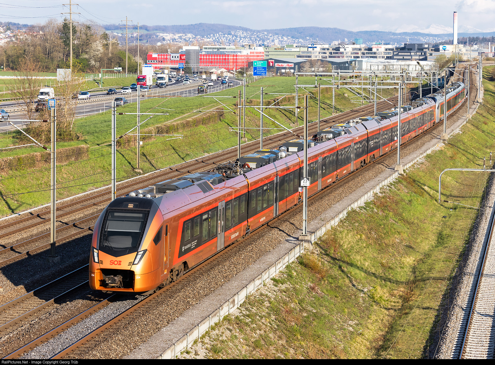 Traverso" RABe 526 # 204/104 of the Südostbahn (SOB), coupled with "Flirt" RABe 526 # 001, is running the IR 2378 of the line IR 35 "Aare Linth" from Chur via Sargans-Pfäffikon SZ-Zürich-Olten-Burgdorf to Berne, between Dietikon and Killwangen-Spreitenbach.