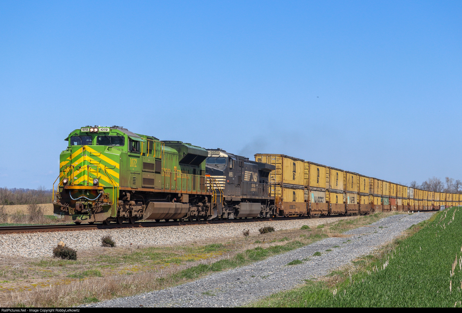 Green All Around: NS 1072, the Illinois Terminal unit, charges south through the small town of Crimora, VA located about 5 miles north of Waynesboro, VA, as the train starts its long journey through the mountains of the Shenandoah Valley.