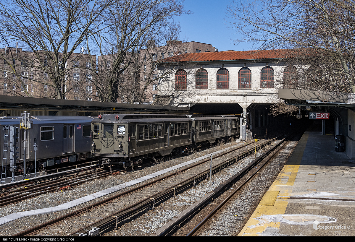 On the morning of March 26th, 2023, a New York City Transit training train consisting of vintage Standard "Lo-V" railcars emerges from under the original New York Westchester & Boston Railway Morris Park station house on the IRT Dyre Avenue Line in the Bronx borough of New York City. Morris Park was opened on May 29, 1912 and is the only station on the line listed under the National Register of Historic Places.