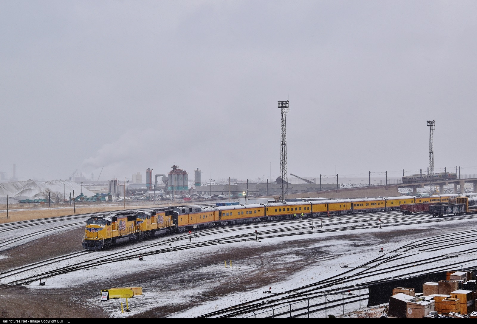 A Union Pacific Officer's Special train sits in a snowstorm in the North Yard in Denver, waiting for passengers to arrive.