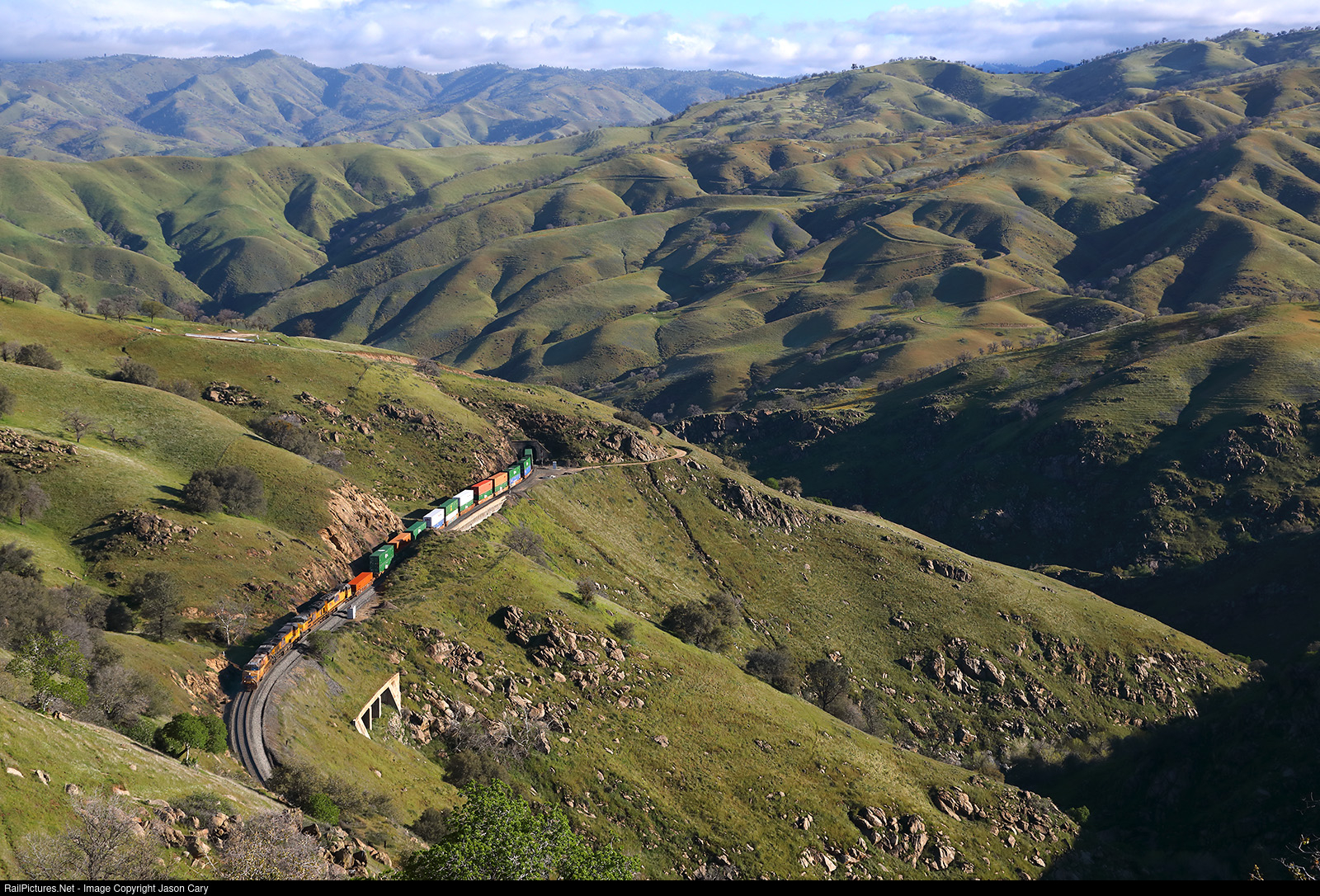 Orejano Canyon A Union Pacific Stack Train battles the steep grade and Curves above Cliff. The train has just exited Tunnel 7 and will soon plunge into Tunnel 8. A Massive concrete retaining walls help hold the right-of-way close the mountainside as the rails wrap along the rim of Oregano Canyon. The train was long had no DPU and crawled at walking speed up the mountain. Note: The photo was taken with permission and a written release.