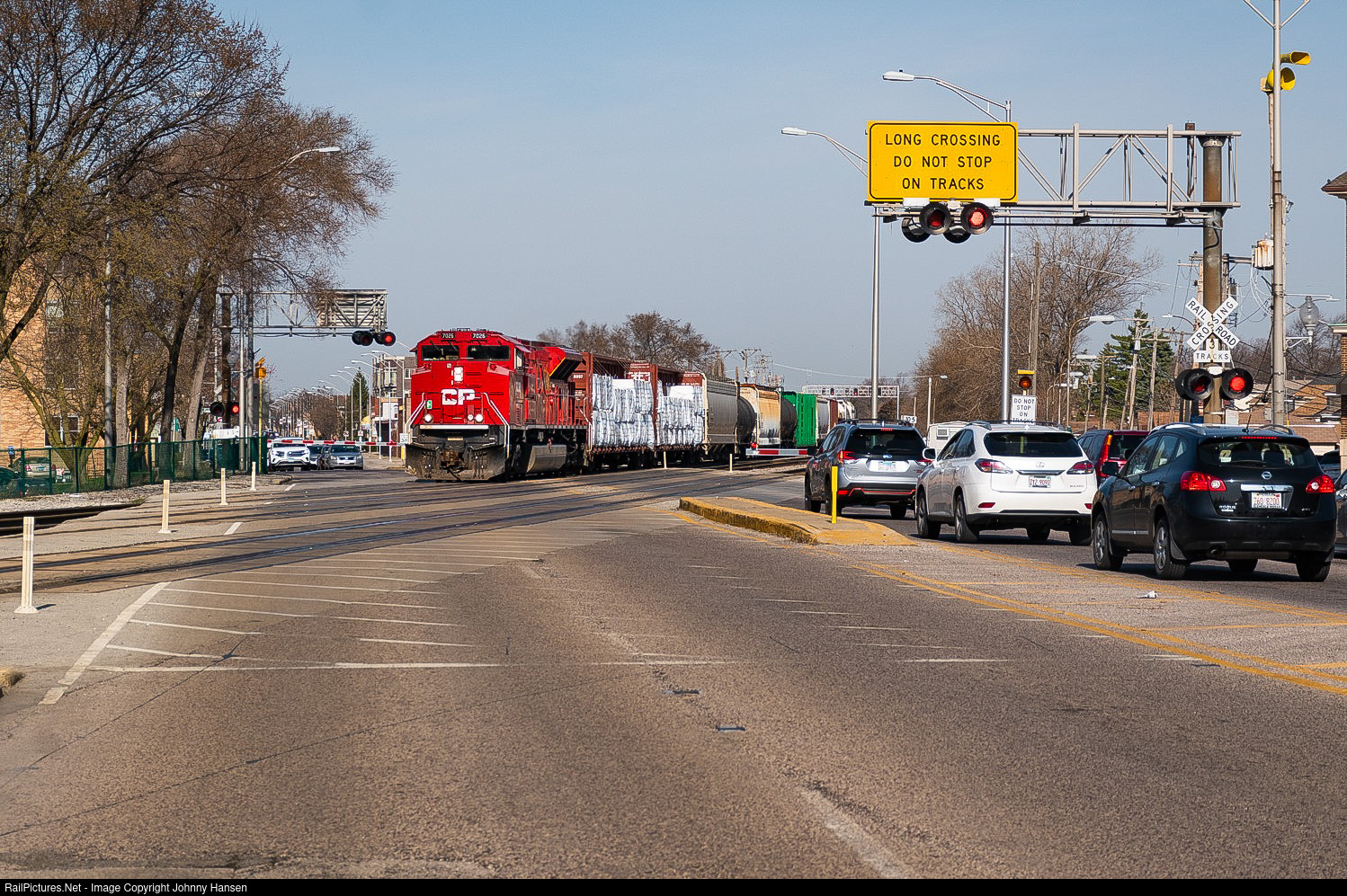 | Early Easter morning, CP 230 crosses the most ‘dangerous’ railroad crossing in Illinois at Grand Avenue in Elmwood Park. CP SD70ACU 7026 is at the front with a 1x1 consist. Back In 2005, a Metra train hit 5 cars on this crossing, causing a chain reaction involving 12. |