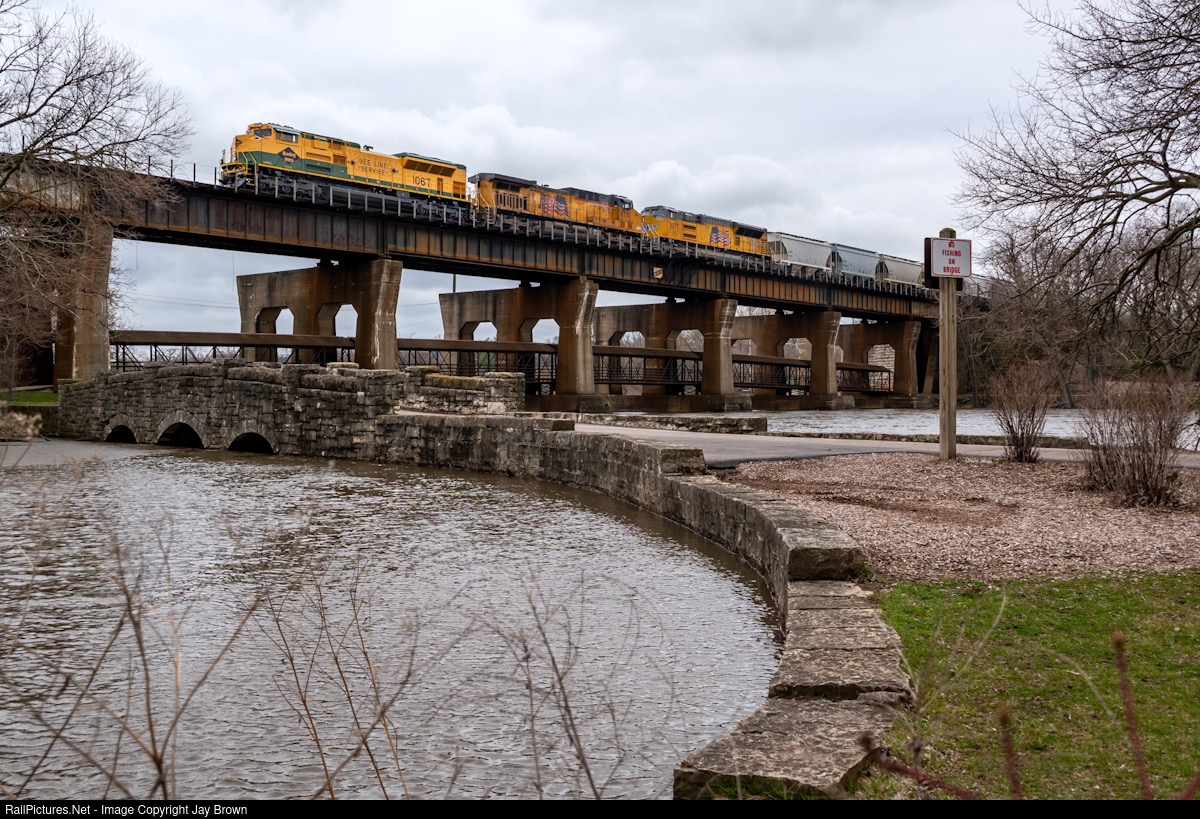 After receiving a shiny new coat of paint in NS’s Altoona Shops out in Pennsylvania, the new & improved Reading Heritage unit glides over the Fox River in Geneva, IL. This was its first run on foreign rails since it hit the paint booth, and it blends nicely with the UP motors in tow.