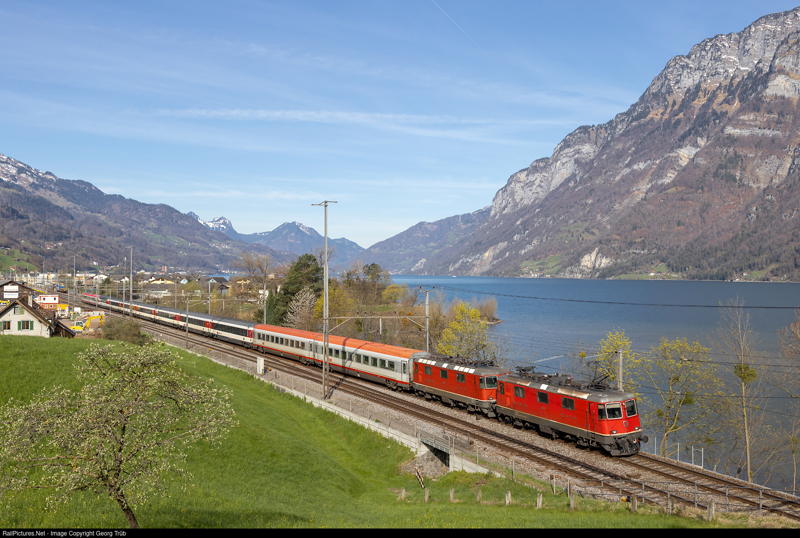 Re 420 # 181 and # 121 (Re 4/4 II # 11181 and # 11121) of the SBB in multiple control are pulling the Eurocity 163 TRANSALPIN from Zürich via Sarans to Buchs SG along the Walensee at Unterterzen. From Buchs SG, the train will run via Feldkirch-Arlberg-Innsbruck-Schwarzach-St.Veit-Selzthal to Leoben (instead of Graz due to track work). The train with a mixed consist of SBB and ÖBB cars is reinforced in front with two austrian second class cars due to Easter monday traffic.