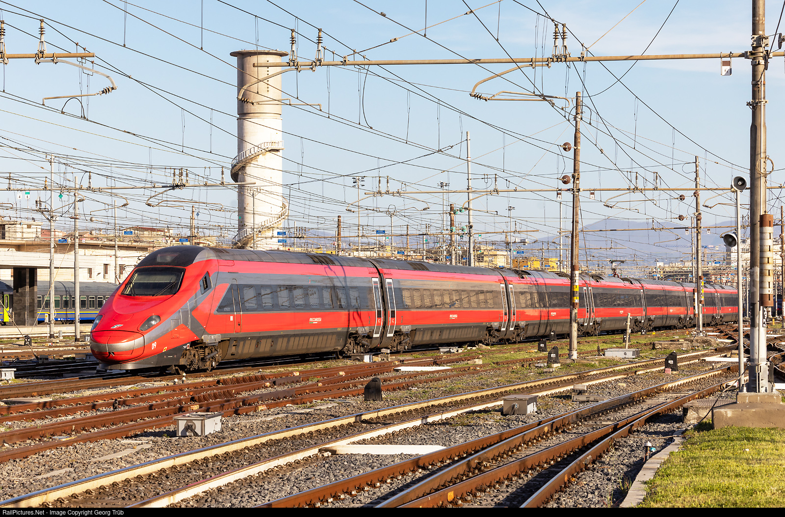| Highspeed tilting train ETR 600 # 009 of the Trenitalia is entering Roma Termini, running as FRECCHIARGENTO FA 8314 from Lecce via Bari-Ancona-Foggia. The Trenitalia has 28 of this trains, built by Alstom from 2007. |