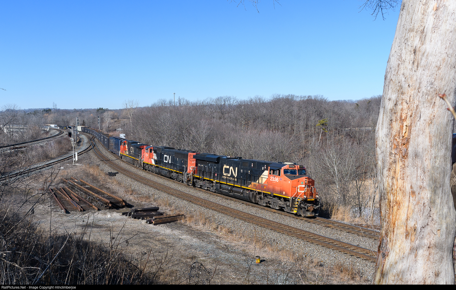 | A trio of CN units lead manifest freight M382 as it rounds the bend of Bayview Junction in Hamilton, Ontario and heads east towards MacMillan Yard in Toronto. The train is on the connector from the Dundas Sub and will soon be on the Oakville Sub, which it will take until getting on the Halton Sub in Burlington. |