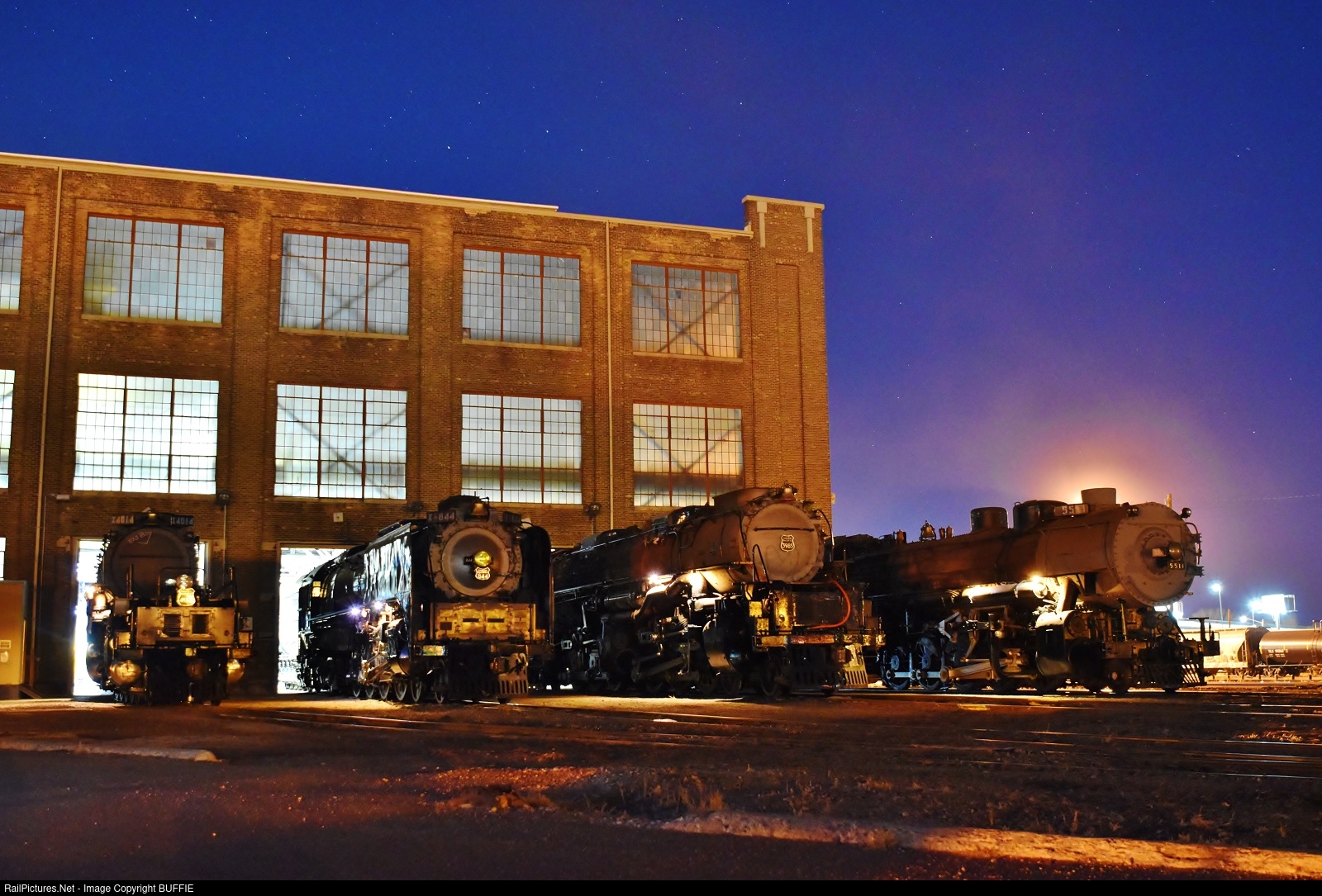 A unique line-up of steam power in the Blue Hour at the steam shop in Cheyenne, Wyoming includes UP 5511, UP 'Big Boy' 4014, UP 844, and UP Challenger 3985.