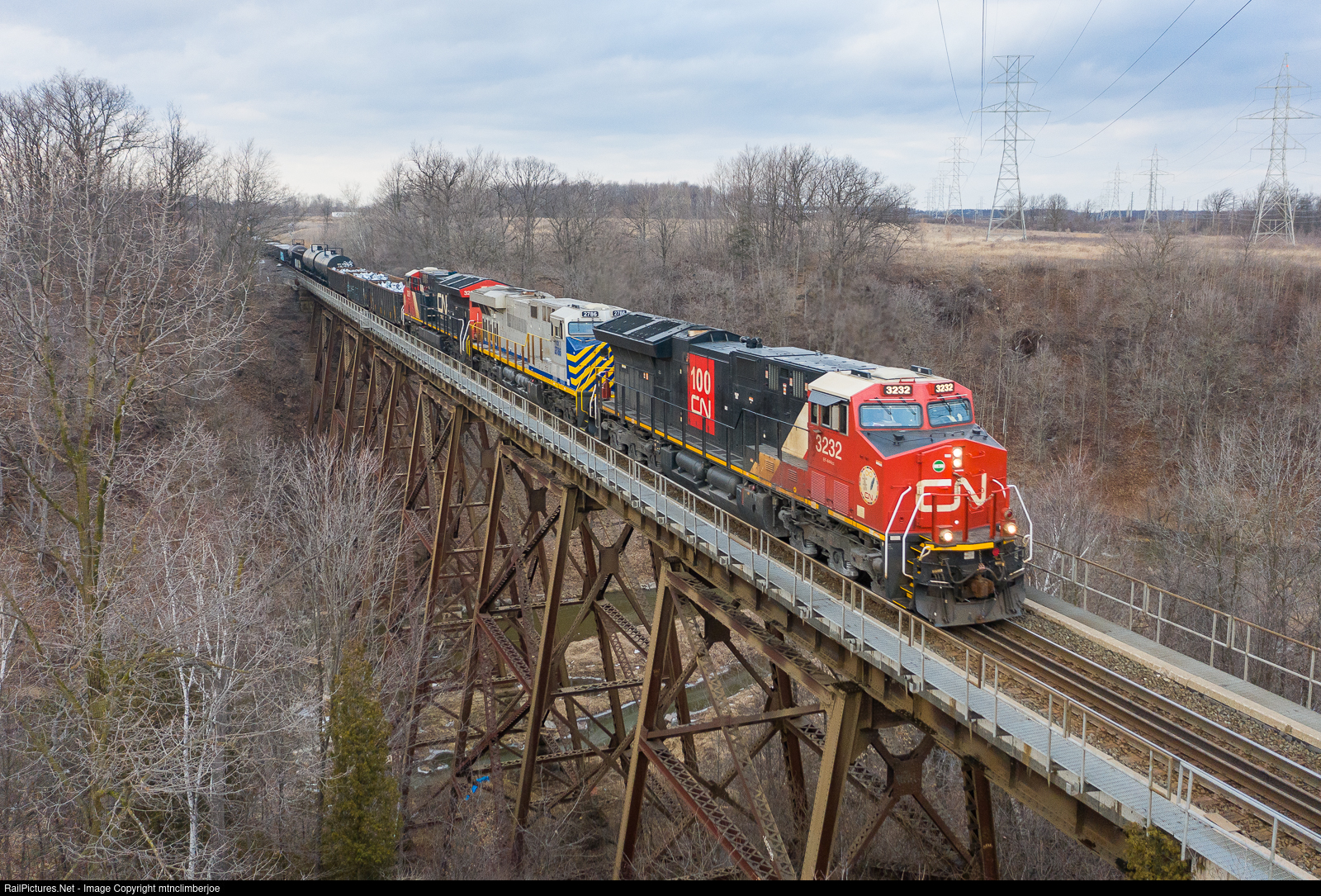 | A pair of Canadian National ET44AC's bracket a former Citirail ES44AC as they lead manifest freight M383 west from Toronto's MacMillan Yard to Sarnia, soaring over the Bronte Creek trestle outside of Burlington, Ontario on the Halton Subdivision. The bridge has an interesting track arrangement, with double track on either side and comes down to single track for a control point that ecompasses the trackage over the bridge. |
