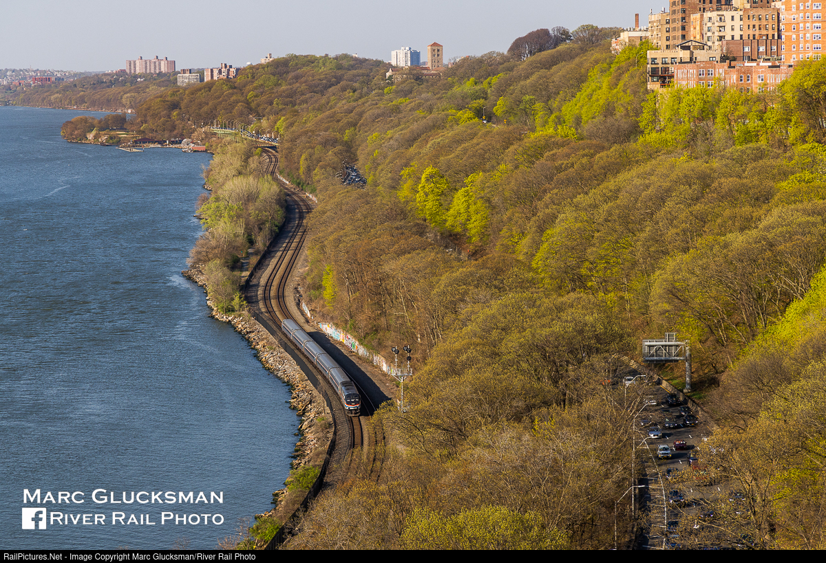 Spring Springs. As Amtrak Train 290 travels downtime Empire Corridor with AMTK 713 (Phase III, P32AC-DM) leading, it is noticeable that a sudden arrival of warm weather has caused the trees to begin to flower, bringing an end to the dreaded "stick season" on Thursday, April 13, 2023. Brightly colored leaves obscure the Henry Hudson Parkway, but cannot hide The Met Cloisters, sitting high above Fort Tryon Park. This view from the north walkway of the George Washington Bridge is available due to the closure of the south walkway for construction. And yes, this scene is all in Manhattan, New York County, New York.