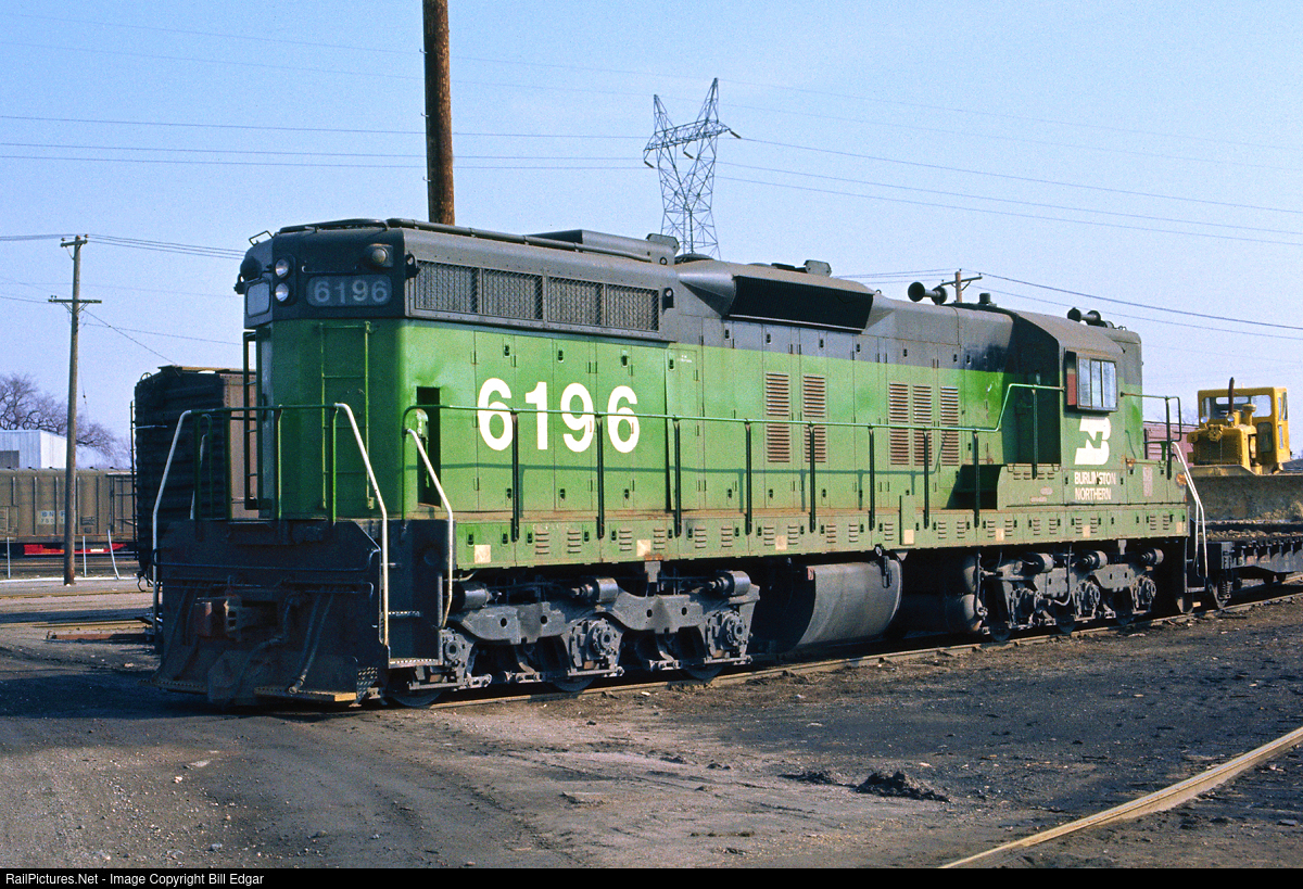 | BN 6196 is parked at Dale St. Shops in St. Paul, MN for some maintenance work. This Phase 2 SD9 was built in September 1957 as CBQ 449 and when retired by BN went to the Port of Tillamook Bay. |
