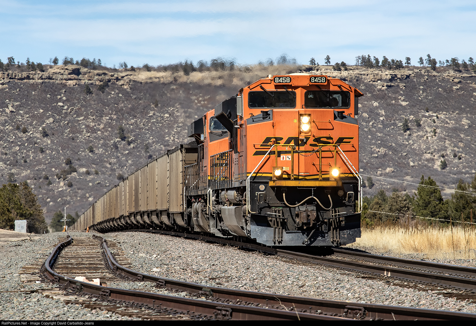 124 car loads of Rawhide Mine, WY coal are bound for Halsted, TX as they slowly traverse the Palmer Divide near Larkspur, CO. Four, six-axle locomotives battle the one to 1.4% grade of the northern slope of the divide where coal trains get down to single digit speeds as they inch towards the 7200' summit at Palmer Lake.