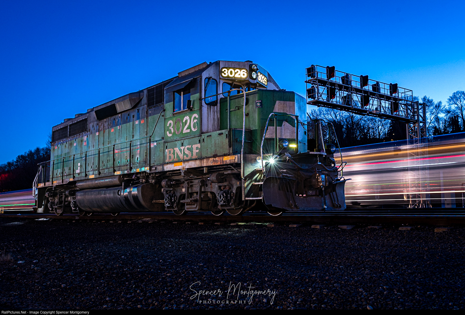 BNSF 3026 sits in South Seattle while a very late Coast Starlight passes.