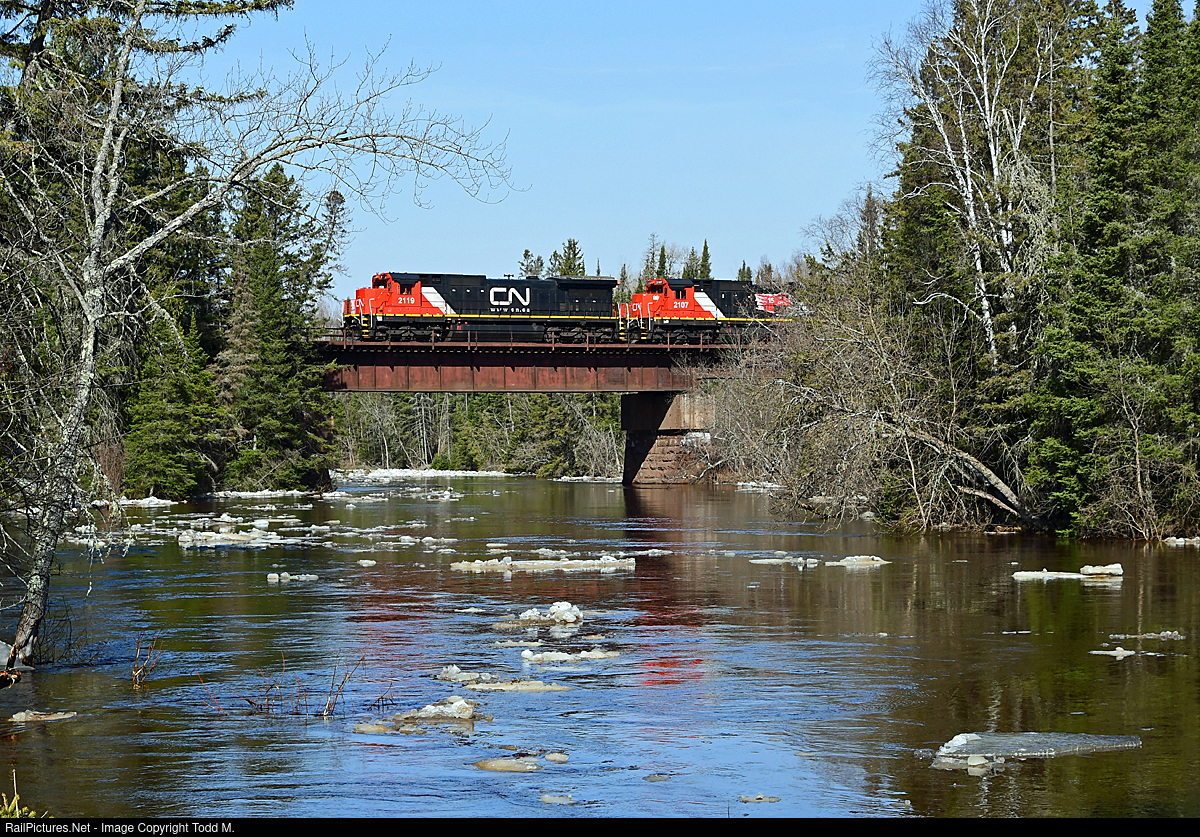 | A week ago it was 10 degrees and snowing, today it was 70 degrees and sunny. The snowmelt was fast this spring across NE Minnesota and took less than a week so the rivers are high and moving fast. CN 2119 crosses over the swollen St. Louis River as they slow down to make the turn into the United Taconite property |
