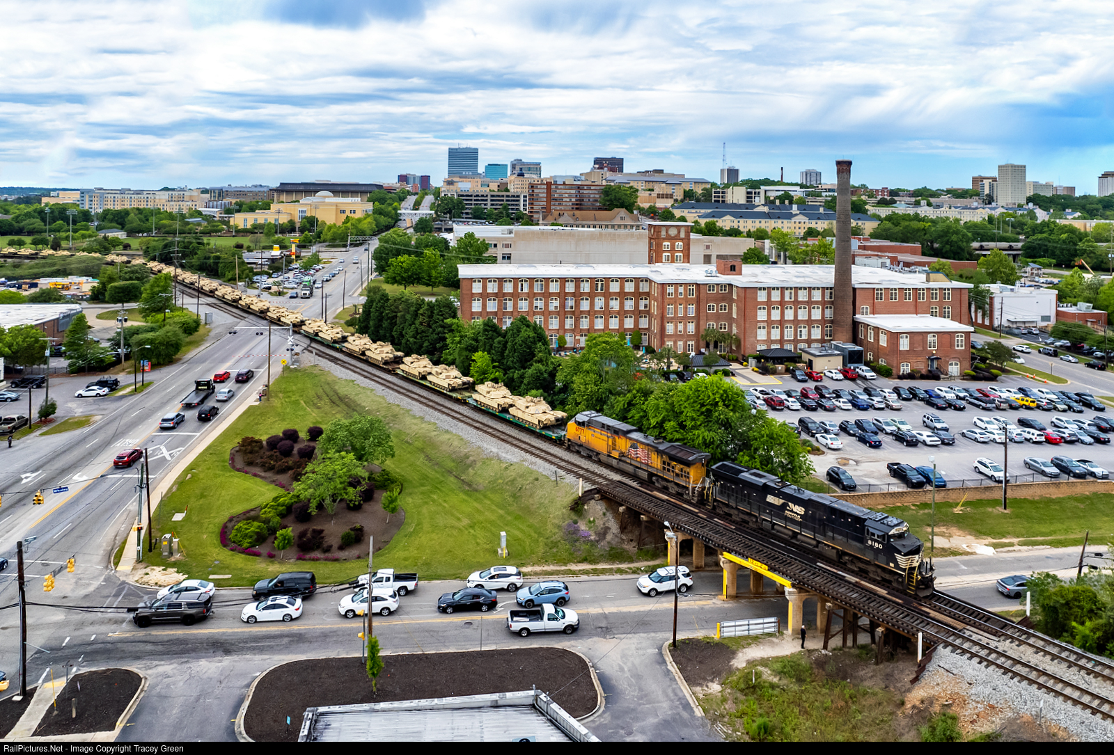 | Power. Usually, military cargo travels on a separate train but on this day a number of Abrams tanks were up front on the daily NS 192 mixed freight train. |