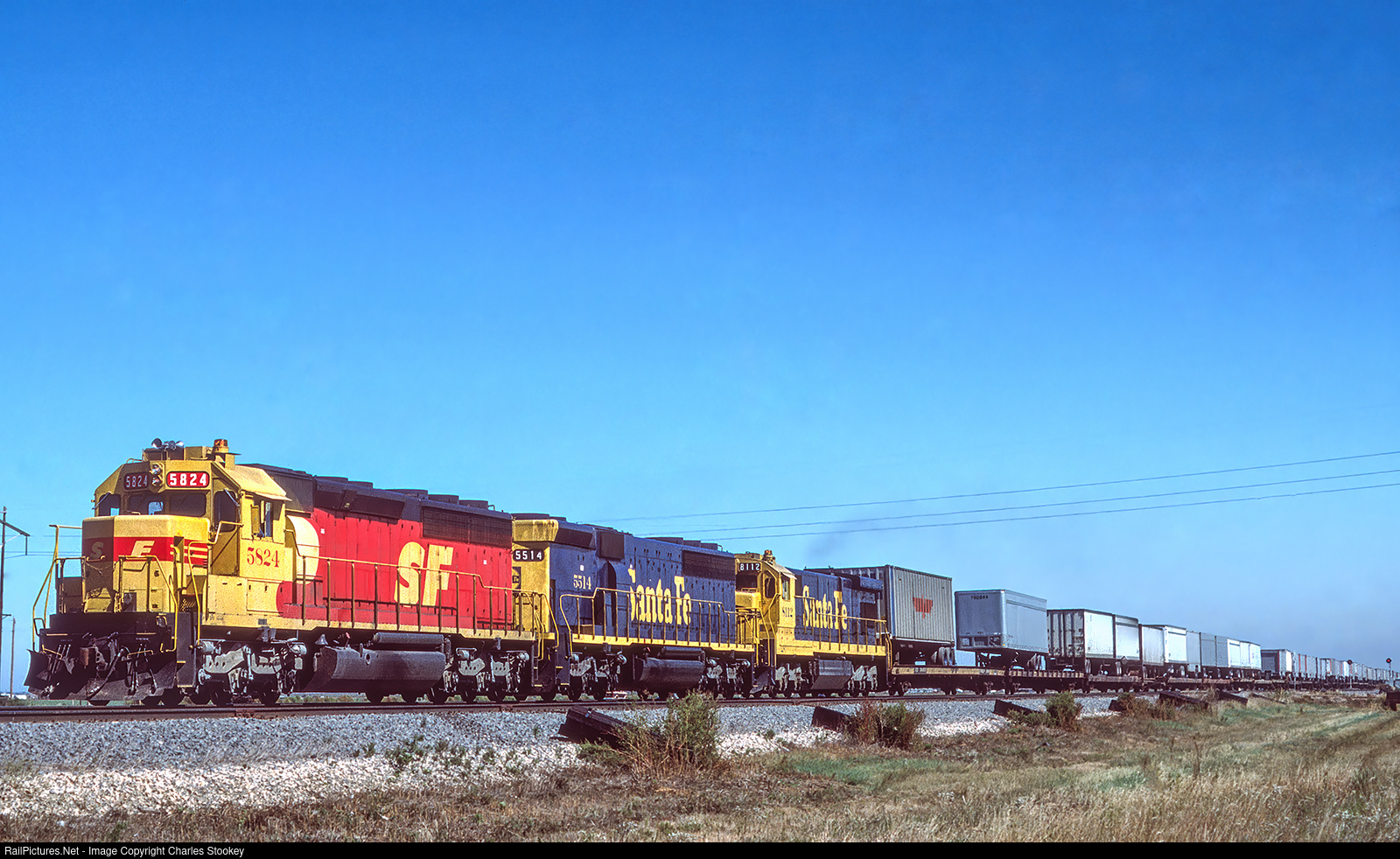 UMBARGER TX Oct 8 1988 — Santa Fe SD45-2u 5824, SD45-2B 5514 and C30-7 8112 lead a TOFC train on the journey west to Clovis NM for refueling and a new crew. EMD built the unit in May 1972 and delivered it in bookends livery. Sometime after August 26 1972 is was painted in yellow warbonnet. In July 1986 it was rebuilt as an SD45-2u, painted in failed Southern Pacific-Santa Fe merger paint. Sometime before Jan 1 1991 it regained its yellow warbonnet paint. Morrison Knudsen performed maintenance on it in April 1994. In February 2000 it was relettered and renumbered BNSF 6474. My photo.