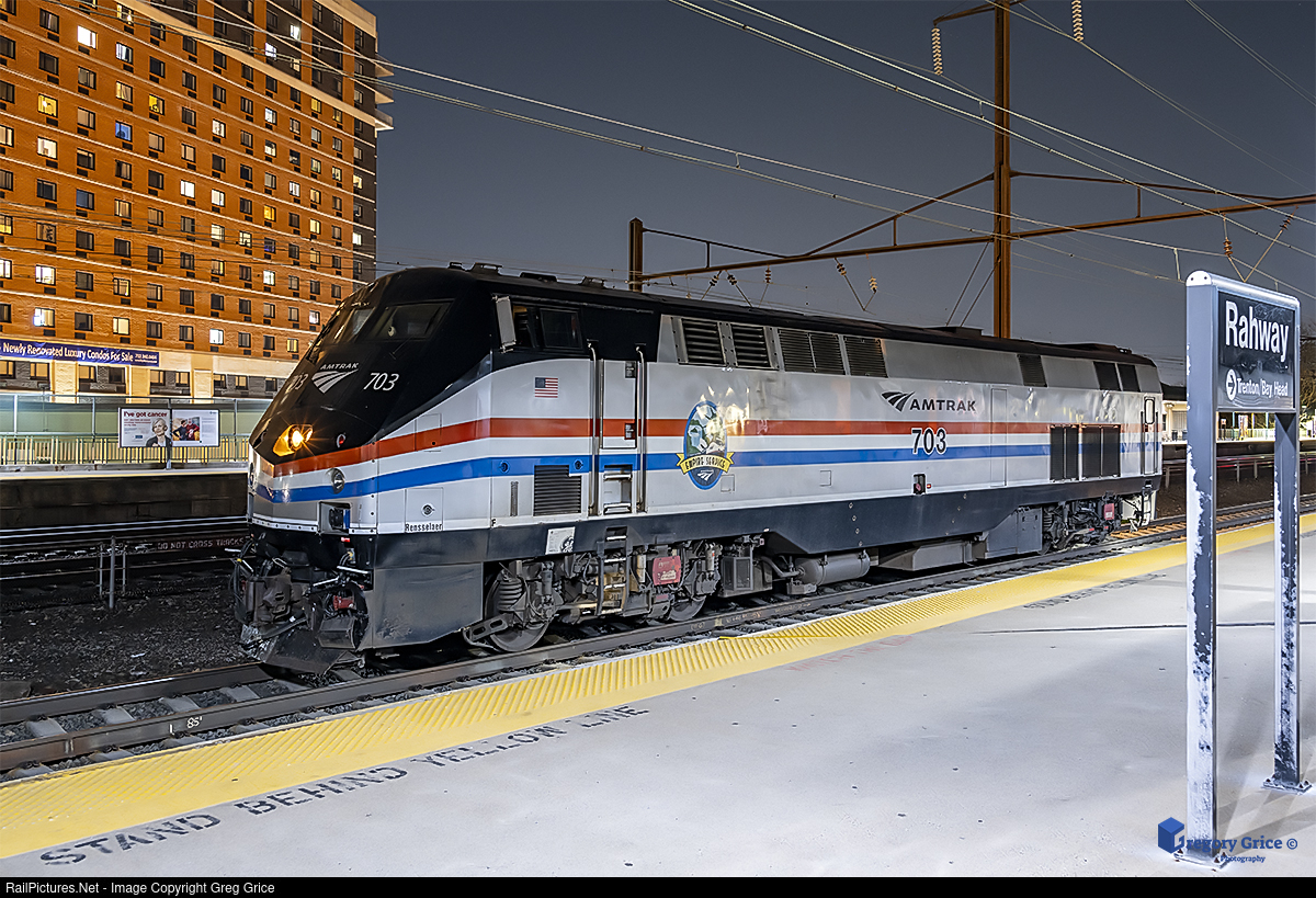 On the night of April 13th, 2023, Amtrak YN-2, with P32AC-DM 703, is seen holding east of UNION Interlocking at New Jersey Transit's Rahway station on the Northeast Corridor. YN-2 made their way from New York Pennsylvania Station to rescue Acela 2169, which was disabled west of this location at ROADS Interlocking.