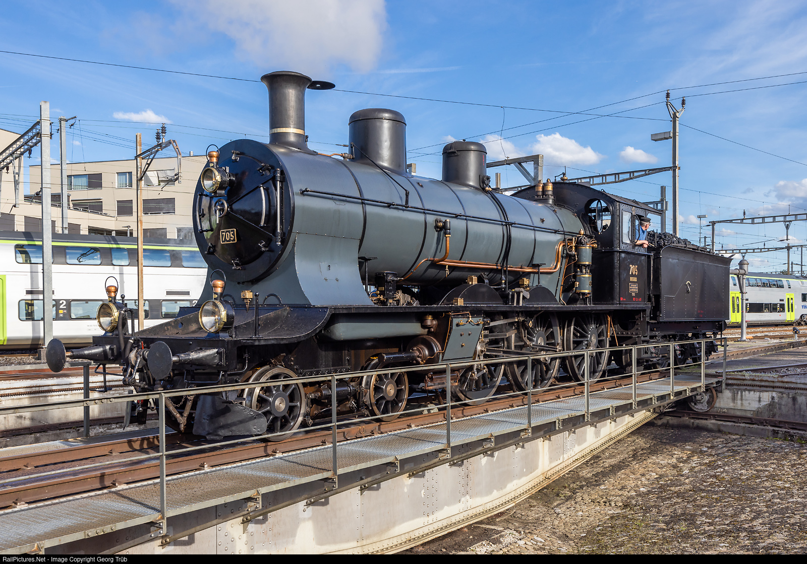 | The 4-6-0 fourcylinder compound express train steamlocomotive A 3/5 # 705 of SBB Historic came from Brugg AG to Lyss on a transfer run, for a charter train in western part of Switzerland the following day. The elegant "racehorse" of 1904 was turned on the turntable of Lyss. |