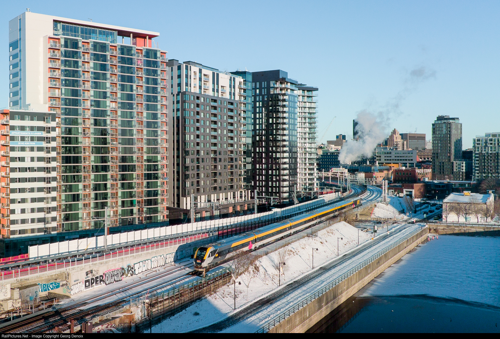 Although already entering revenue service, this time VIA Rail's new Venture set was on a non-revenue run, passing in front of the condo towers not far from Montreal's Central station.