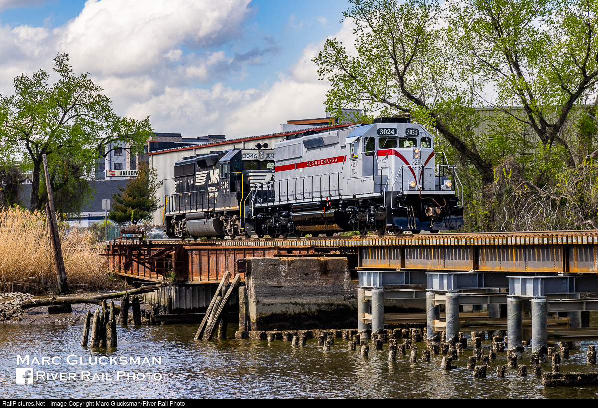 The Heritage Keeps On Coming. Throwing back to an even older period in its history, New York, Susquehanna, and Western Railway released SD40-2 3024 (ex-NS 3553, née-BN 7200, 10/1979) in silver and maroon on the afternoon of Monday, April 17, 2023. The locomotive was brought from Butler, New Jersey to Ridgefield Park, New Jersey in the afternoon, and immediately put into service that day on a local job. After recently painting most of its SD70M-2 fleet in its corporate yellow and black, there was still at least one more surprise in store for fans of the railroad. On its debut run in new paint, the locomotive is seen crossing the Hackensack River from Hackensack, New Jersey to Bogota, New Jersey.