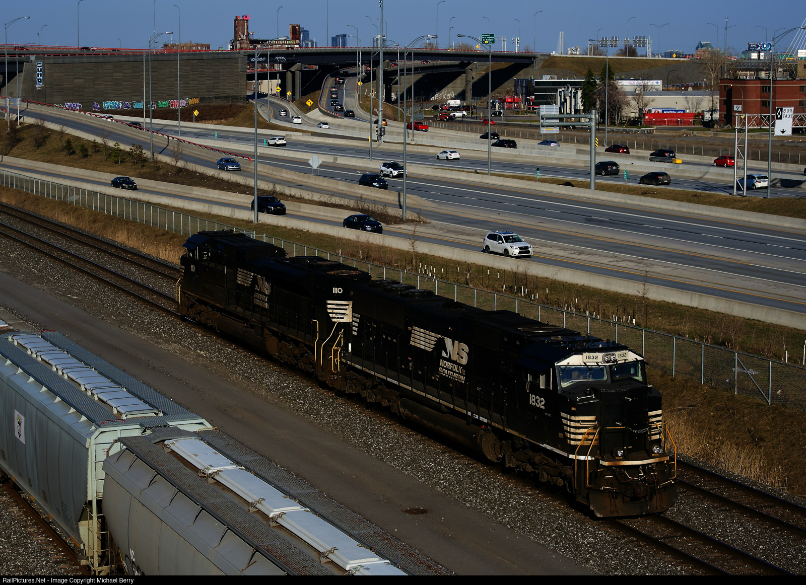 | Non-standard nose paint. A pair of NS EMD units are headed to the Port of Montreal to pick up intermodal traffic. NS 1832 was involved in a derailment in 2020 and features a not fully painted nose. NS 1832 was rebuilt from standard cab SD70 NS 2543. |