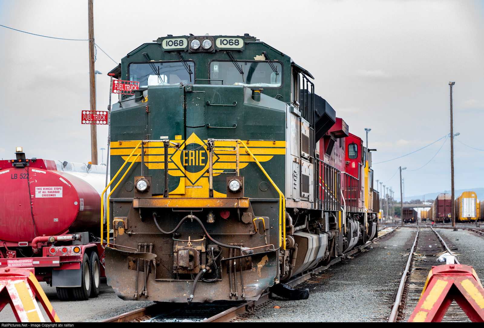 | NS 1068, the Erie heritage unit, is refueled at Milpitas after leading an auto train in that terminated at the yard |