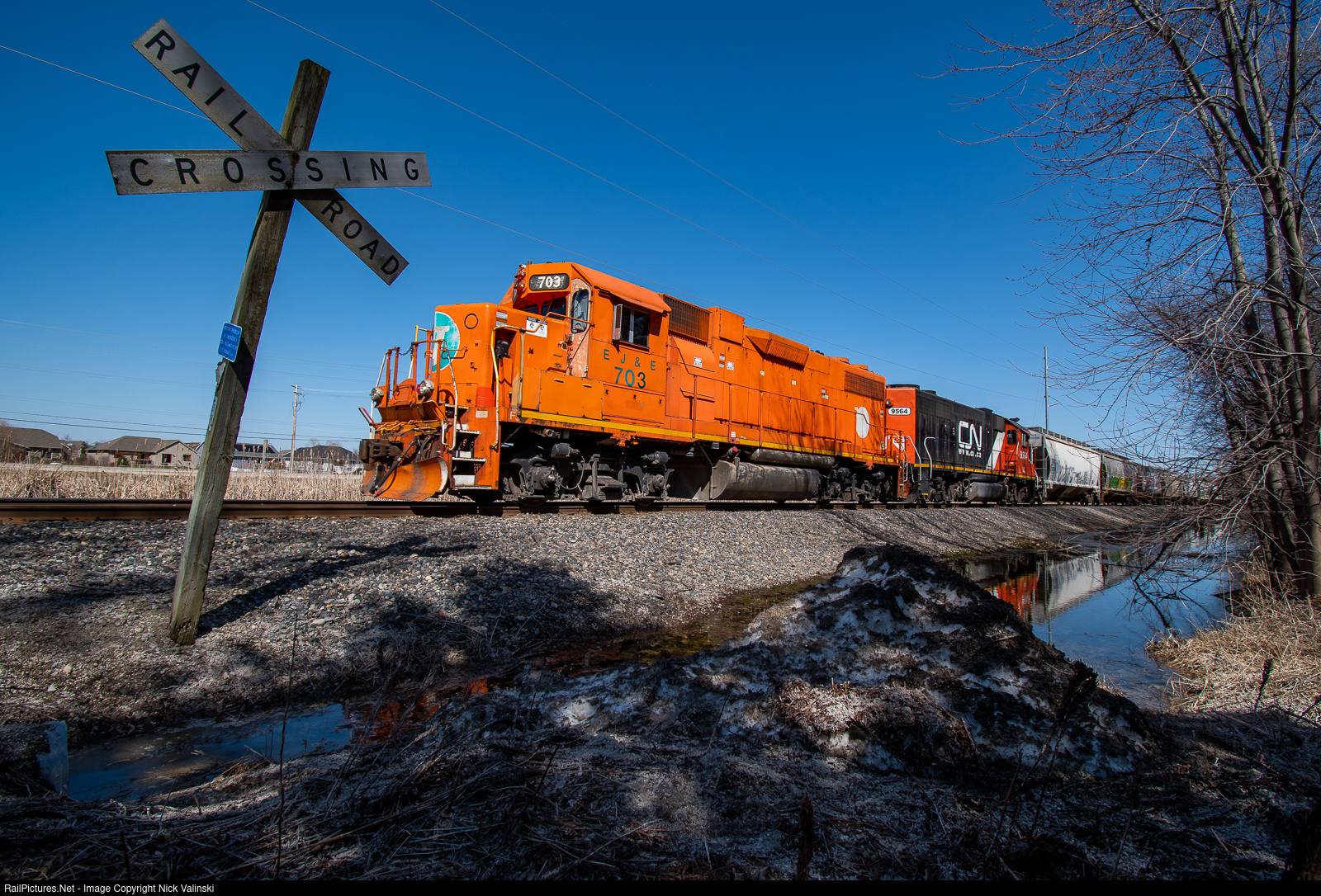 | EJE 703 leads a repainted IC motor on the backswing of L533 back to Neenah from Chilton. The train had to wait at Hilbert for some section work to clear up which allowed the sun to set more west for better shooting. Here the train is shot by an old Milwaukee Road crossbuck as they descend into Menasha. They would return into town with 25 hoppers from Country Visions but before returning home for the night the crew would have to switch Intertape Polymer Group and the Banta Spur in Menasha. |