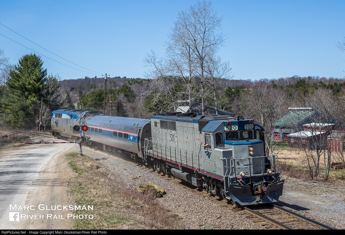 Returning From The Return. On April 19, 2016, Amtrak Train 975, with AMTK GP38-3H 520 (GOT/CN 500, GP40TC, GMD, 11/1966) was passing Allen Road on the former Delaware & Hudson Railroad now Norfolk Southern in Port Crane, New York on the way back to Albany-Rensselaer, New York under a cloudless sky. After they served GO Transit for over 2 decades, Amtrak purchased all eight GP40TCs and they operated for another career length before being sent to Norfolk Southern's Juniata Shops for rebuild and returning for what has been a successful third act. The AmFleet I cafe is being used as a rider/crew car, allowing the power to travel at track speed. The prior day, this train had brought a number of Viewliner IIs back to the CAF factory in Elmira, New York for repairs.