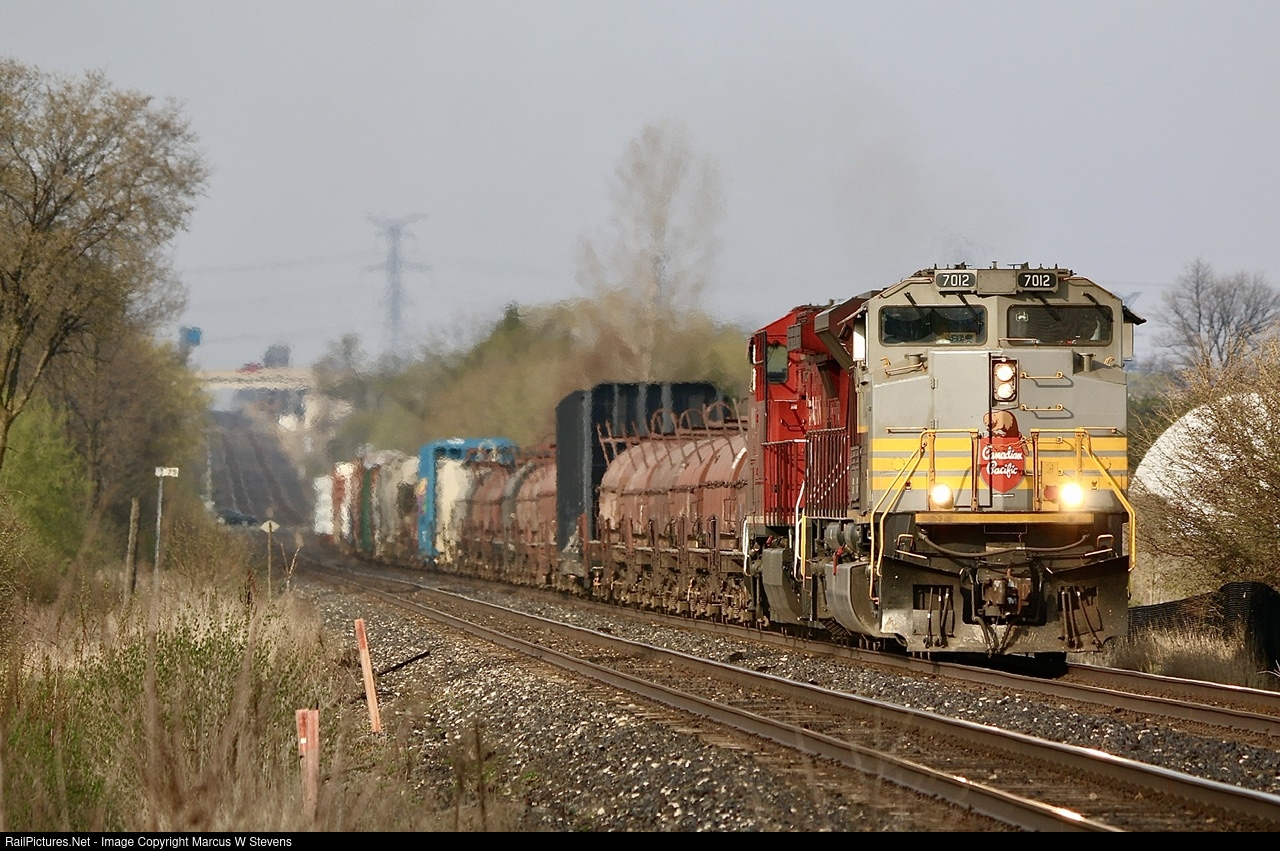 CP train 236 with heritage 7012 has just finished working Hornby yard in the distance and is now getting up to track speed as it exits the dip.
