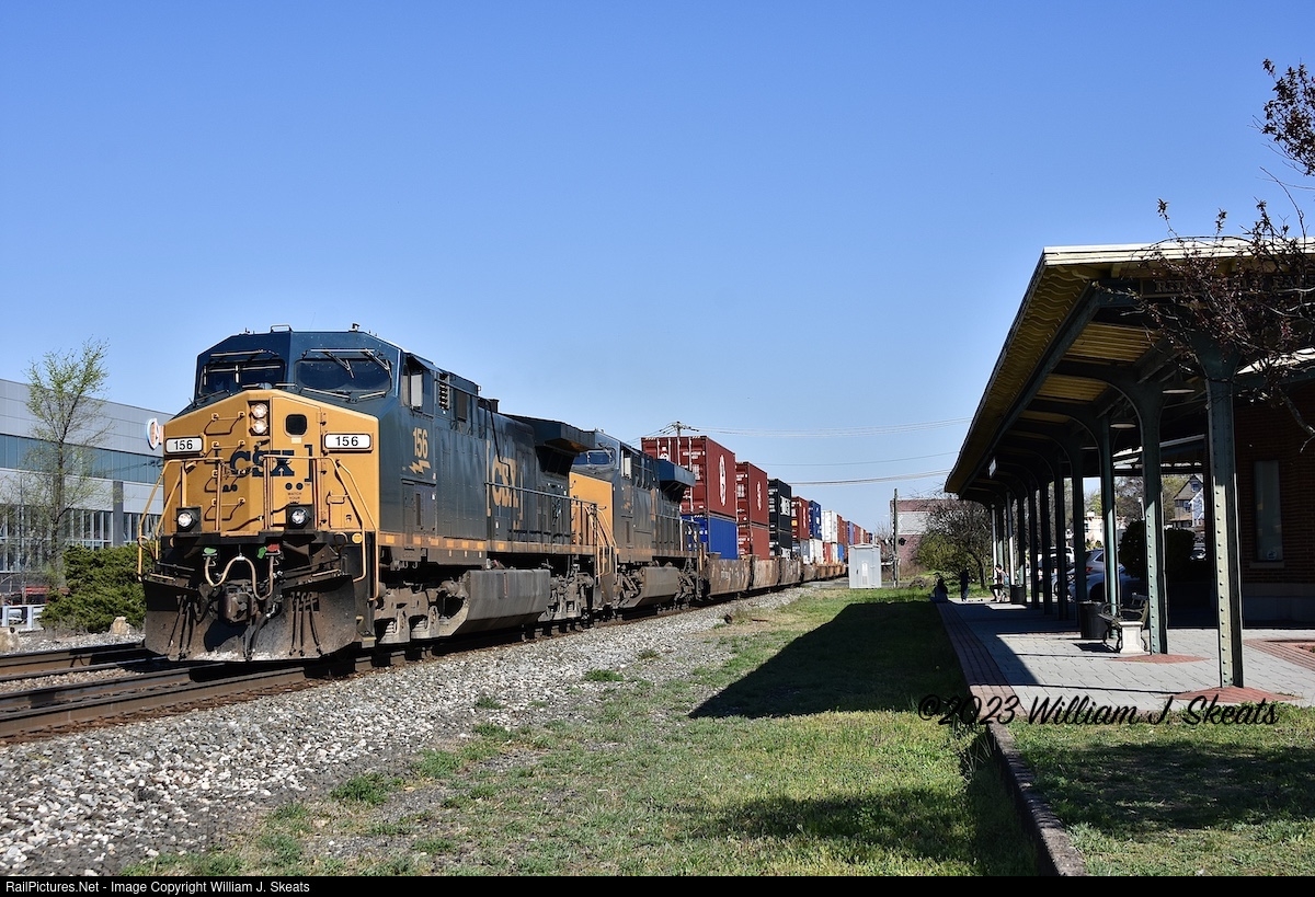 | CSX I168 from Chicago, IL to Port Newark, NJ seen passing the former West Shore Railroad Ridgefield Park Station. Autoracks went to Little Ferry at 7:26 A.M. CSX GE AC4400CW 156 and GE ES44AH 3107 have picked up the rest of their train. |