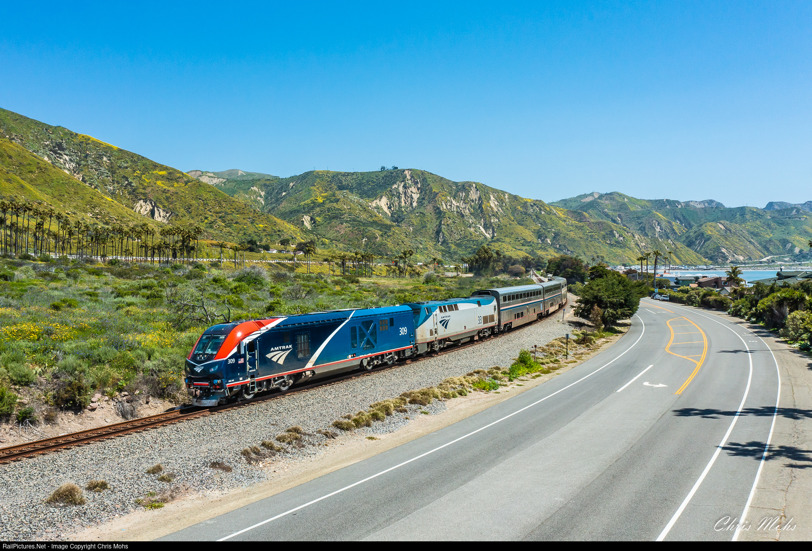 | New Siemens ALC-42 No. 309 leads No.14, the Northbound Coast Starlight around the curve at Faria County Park. |