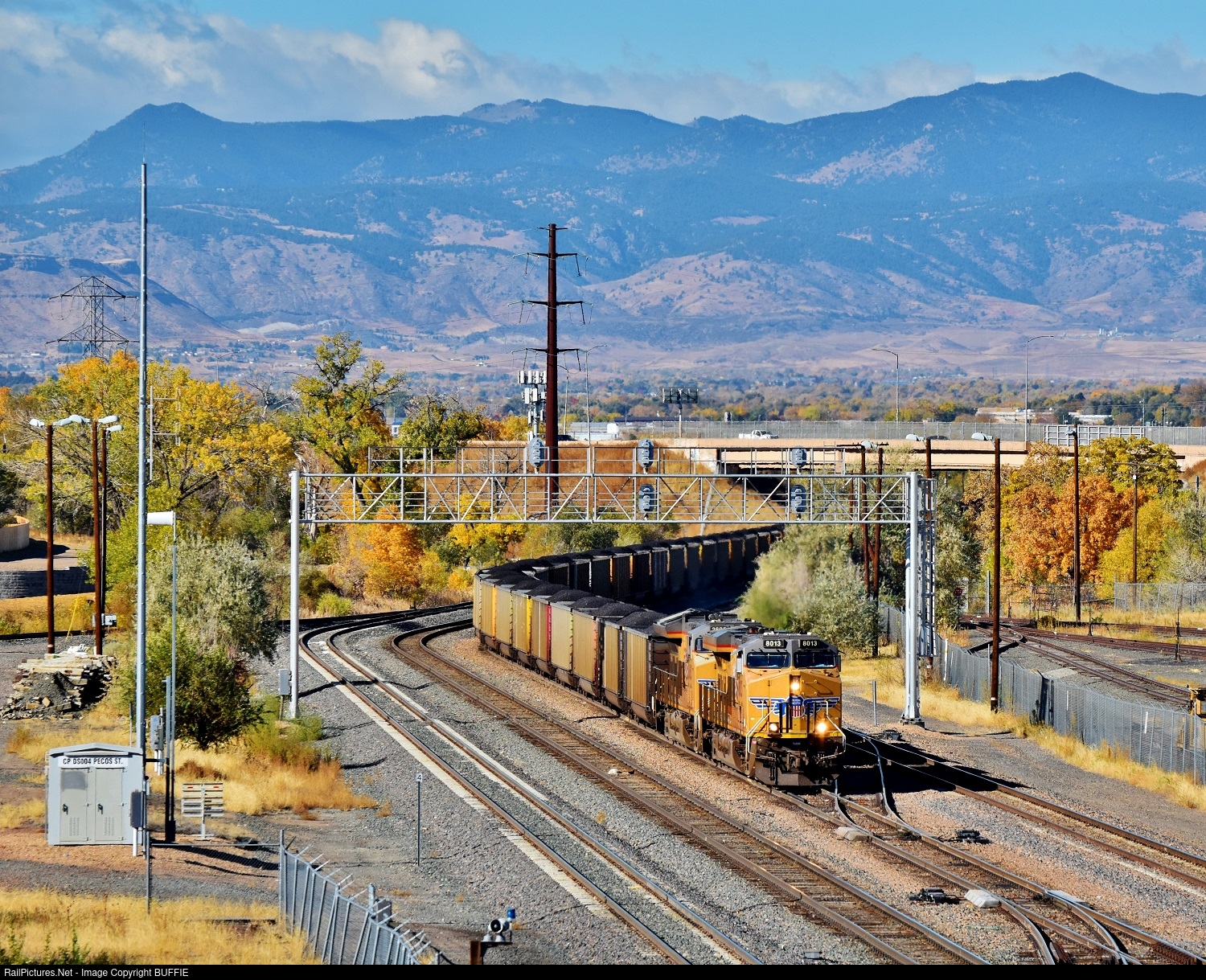 | An inbound UP freight led by UP 8013 (AC45CCTE) passes under the signal bridge before entering the North Yard in Denver, Colorado.