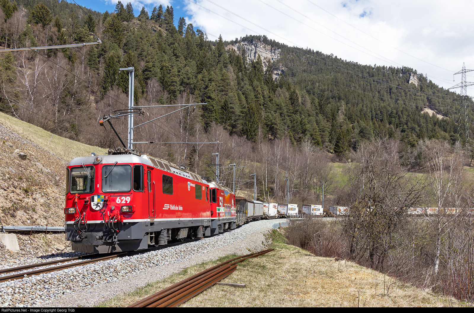 | Ge 4/4 II # 629 and # 617 (in the special paint scheme for 50 years LGB) of the Rhaetian Railway are pulling the freight train 5140 from Pontresina over the Albula line to Landquart freight yard, between Surava and Tiefencastel. |