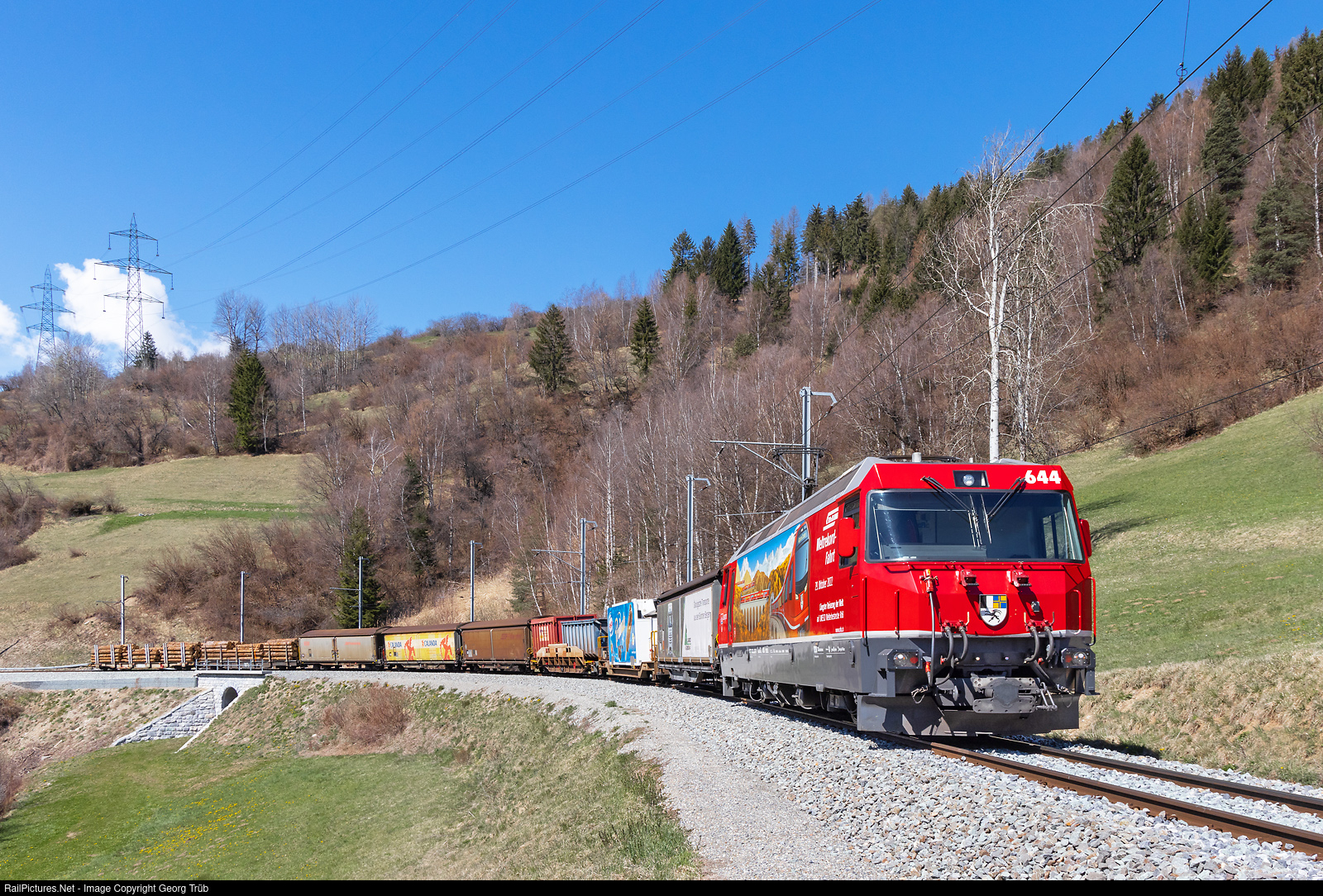 | Ge 4/4 III # 644 of the Rhaetian Railway, in the publicity paint scheme for the world record of the longest narrow gauge passenger train, pulls the freight train 5129 from Chur over the Albula line to Samedan, between Tiefencastel and Surava. |
