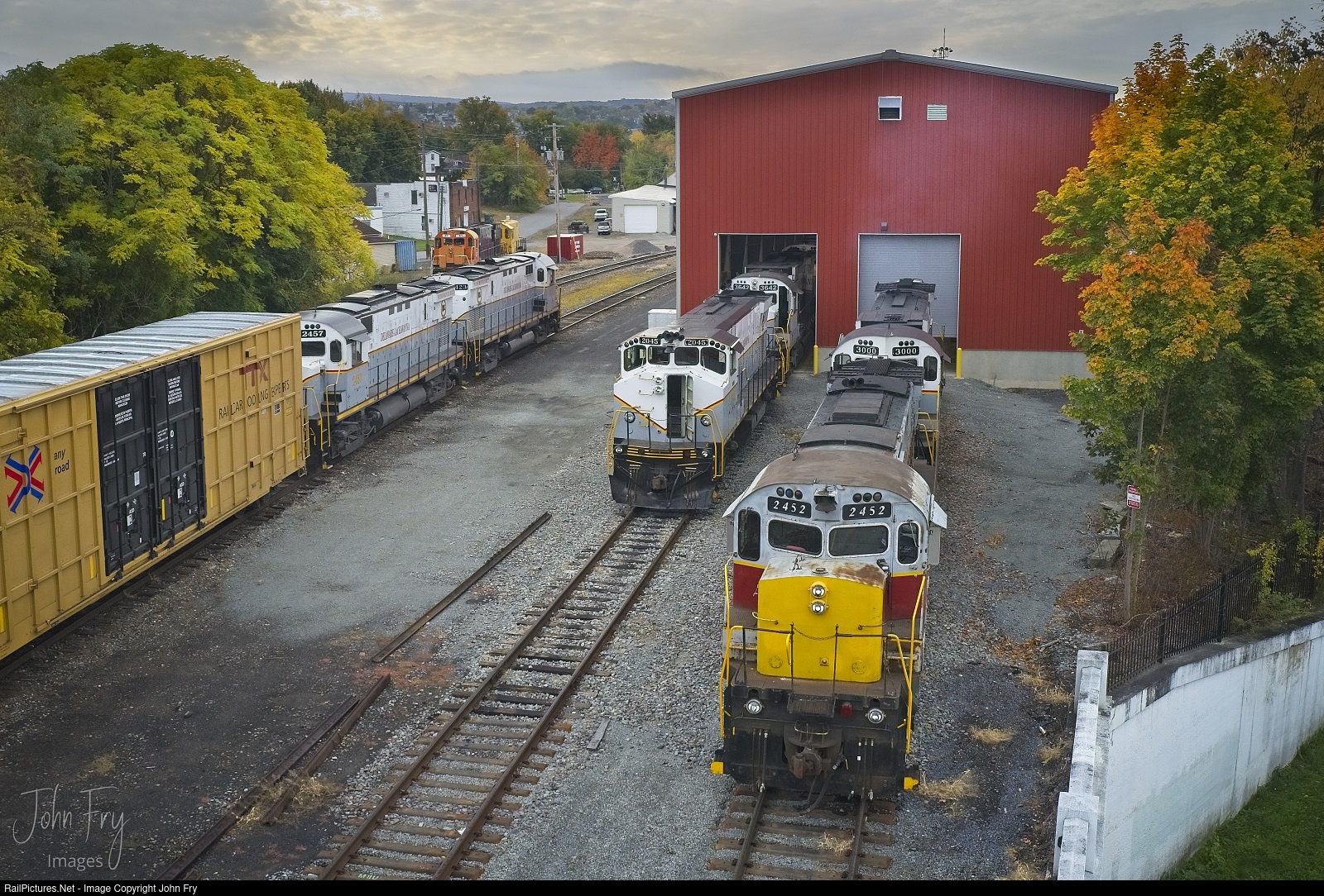 | Its a busy morning view on the backside of Von Storch shop as locomotives are attended to and the local passes through. They have picked up cars and are headed back towards Steamtown. How often can you get 8+ ALCO/MLW locos all in one shot? |