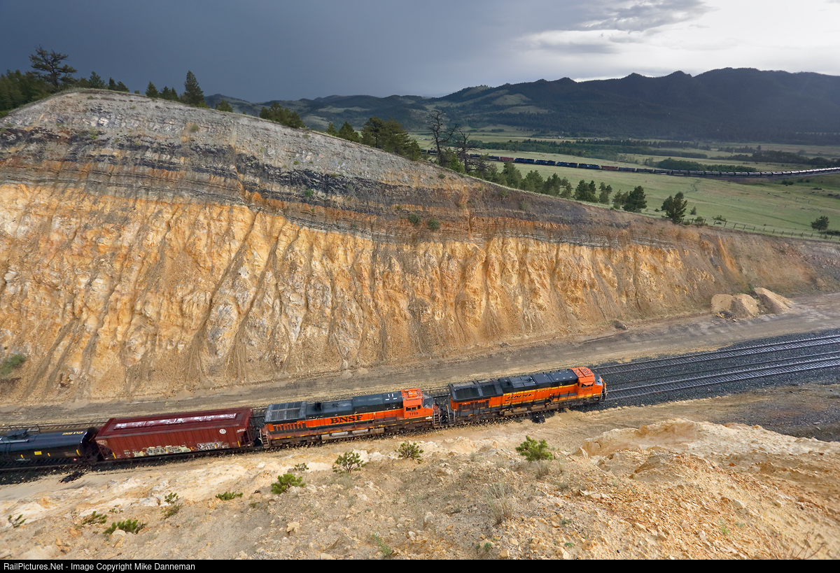 After the passage of a thunderstorm, it’s still raining as a westbound BNSF unit oil train climbs the 2.2 percent grade up Mullan Pass between Austin and Weed, Montana, on the afternoon of July 6, 2022. BNSF GE ET44C4 No. 3904 and GE C44-9W No. 1119 put what traction they can down on the wet rails as the locomotives grind through Iron Ridge, while a four pack of Montana Rail Link EMD SD70ACe manned helpers lean into the middle of the train below on the large horse shoe curve approaching the colorful cut.